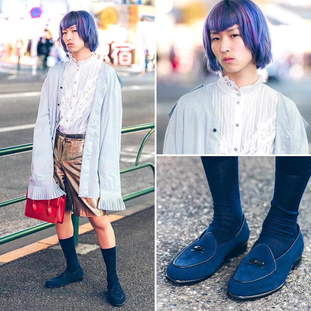 @TAKANOOOH on the street in Harajuku. He’s wearing a ruffle shirt jacket from Chin Mens over a ruffle shirt from The Four Eyed, gold shorts from Desperado, blue suede loafers by Belgian Shoes, and a Jean Paul Gaultier bag.