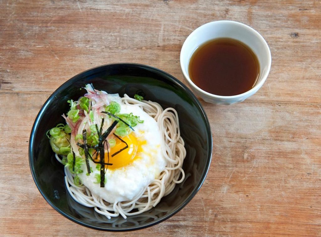 Soba noodles with grated raw “yamaimo” (mountain yam). Yamaimo can be cooked, but in Japan they are usually eaten raw after being finely julienned or grated. (Makiko Itoh photo) #japaneskitchen #Japan #food #instafood #和食 #野菜 #山芋