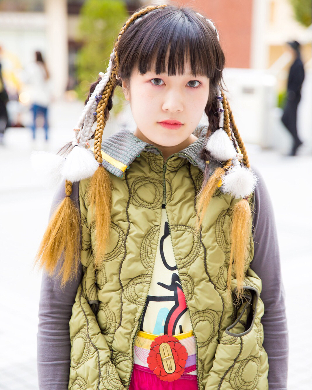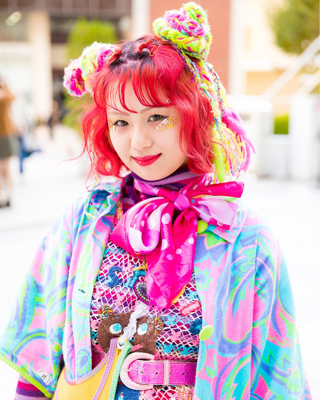 Vintage-loving Japanese fashion students Fuki (@tsuppashiru_) and Haruka (@harukakado) – editors of the street fashion magazine @Fanatic__Tokyo – at Bunka College wearing colorful mixed prints fashion featuring items from Angel Blue, Pom Pom Shop, Hysteric Glamour, Haight&Ashbury, Betty’s Blue, and Poco a Poco.