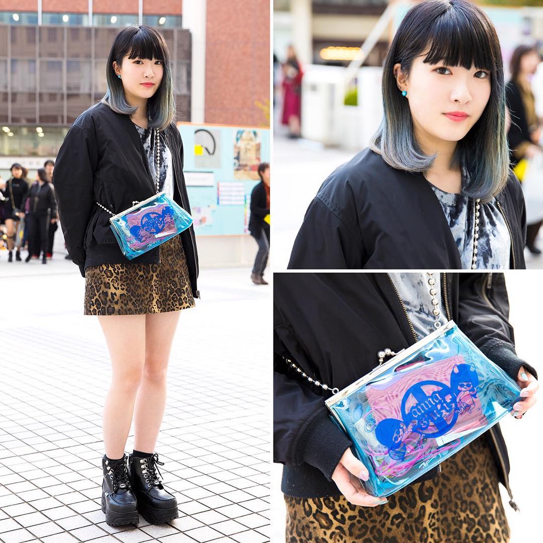19-year-old Japanese fashion student Minami (@__miiiiinsta_) on the street in Tokyo wearing a black jacket with a leopard skirt from Bubbles Harajuku, see through bag by Anna Sui, and Yosuke platform boots.