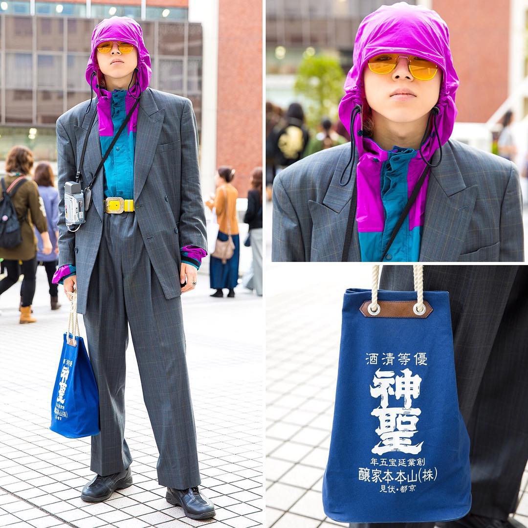 19-year-old Yo (@reddishdarkness) on the street in Tokyo wearing a hoodie under a vintage suit, yellow belt, Mizuno sneakers, and canvas bag. Tokyo FashionAloJapan.com