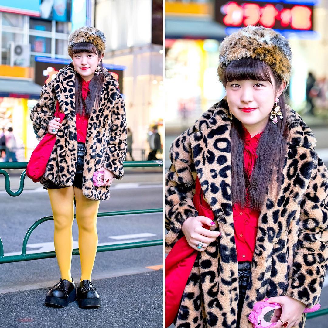 16-year-old Miori (@miori06kidz) on the street in Harajuku wearing a faux fur leopard print coat from Azul with a faux fur hat, Never Mind the XU platforms, vintage jewelry, and a Moschino Barbie iPhone case. Miori is one of the new Harajuku kids we met in 2017. Her personality is always very positive and cheerful on the street.