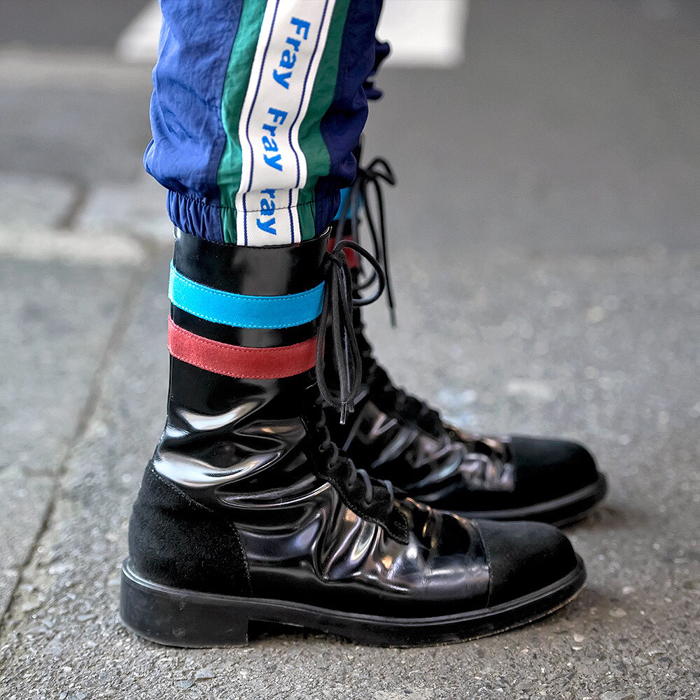 18-year-old @Ryosuke_Igawa on the street in Harajuku on January 1, 2018 (first street snap of the year) wearing a vintage coat over Kenzo x H&M sweater, Fresh Anti Youth pants, Raf Simons boots, and Vivienne Westwood accessories.