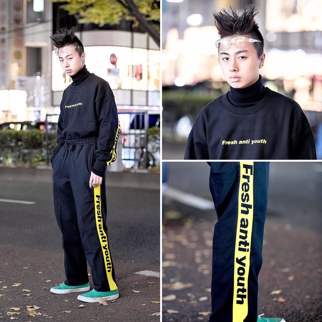 19-year-old Japanese fashion student RAW (@lifecoming1) on the street in Harajuku wearing a matching sweatshirt and pants by Fresh Anti Youth with green sneakers, glasses, and silver accessories. Fresh Anti Youth (@freshantiyouth_japan) has a popup shop on the 2nd floor of LaForet Harajuku through January 4, 2018, so we’re seeing it on the street a lot right now.