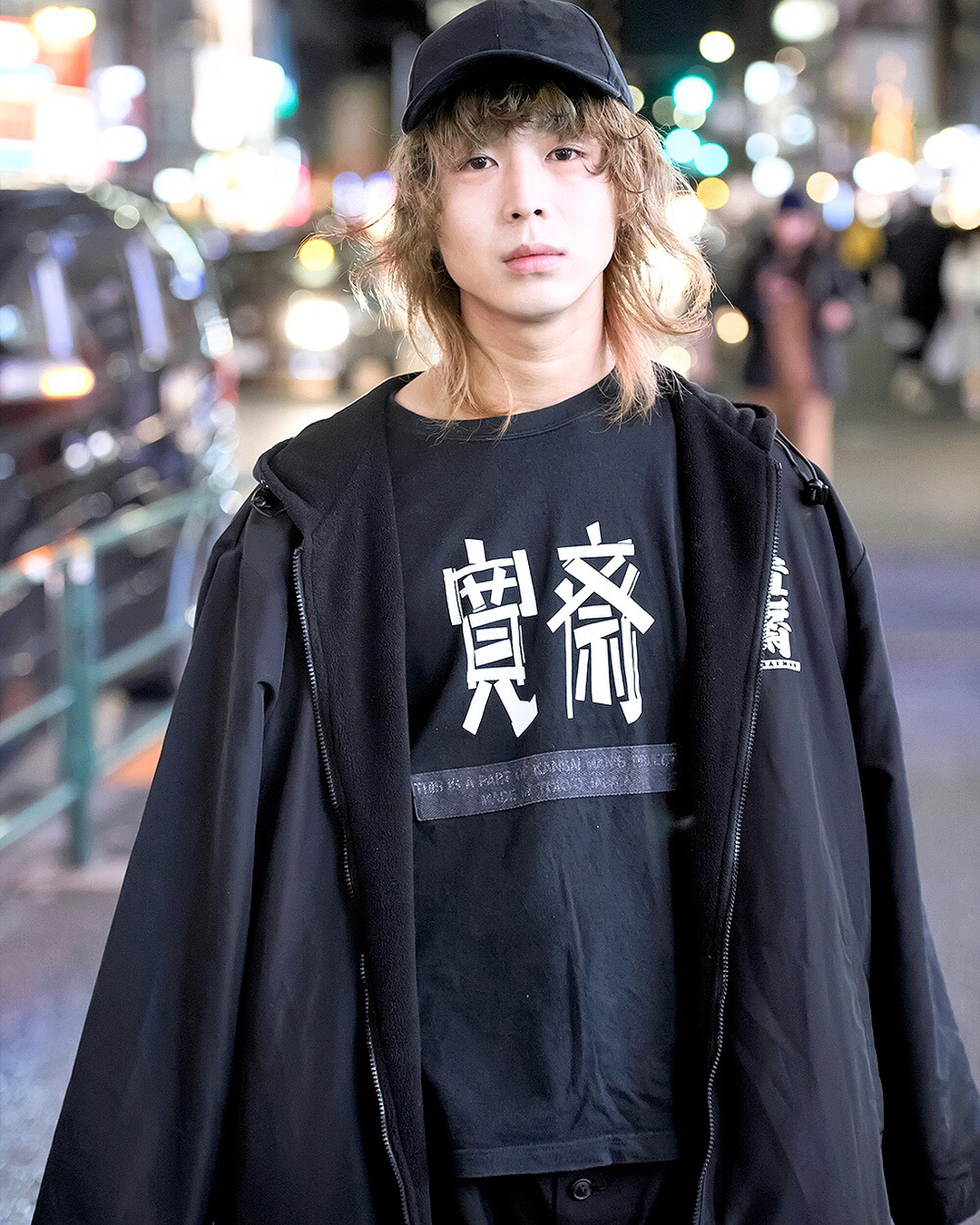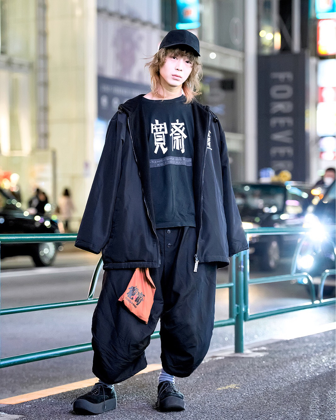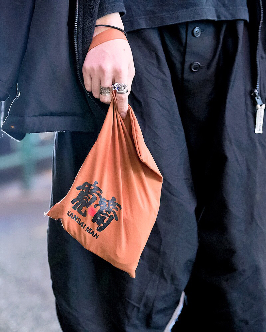 19-year-old Saga_ (@3sence) on the street in Harajuku wearing a vintage Kansai Man by Kansai Yamamoto (@Kansai_Yamamoto_official) hooded jacket over a Kansai t-shirt, Christopher Nemeth pants, Tokyo Bopper shoes, and a Kansai Yamamoto bag.