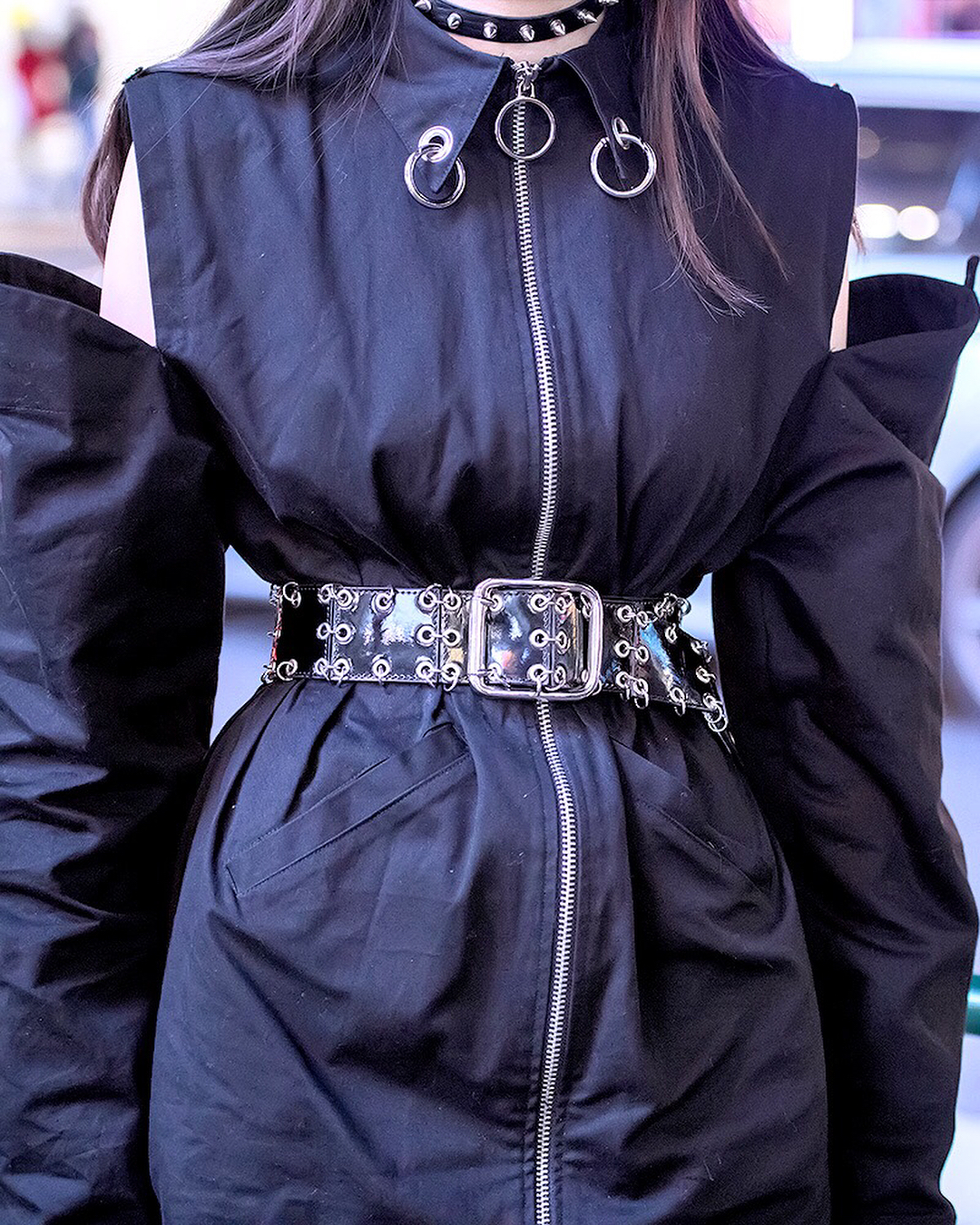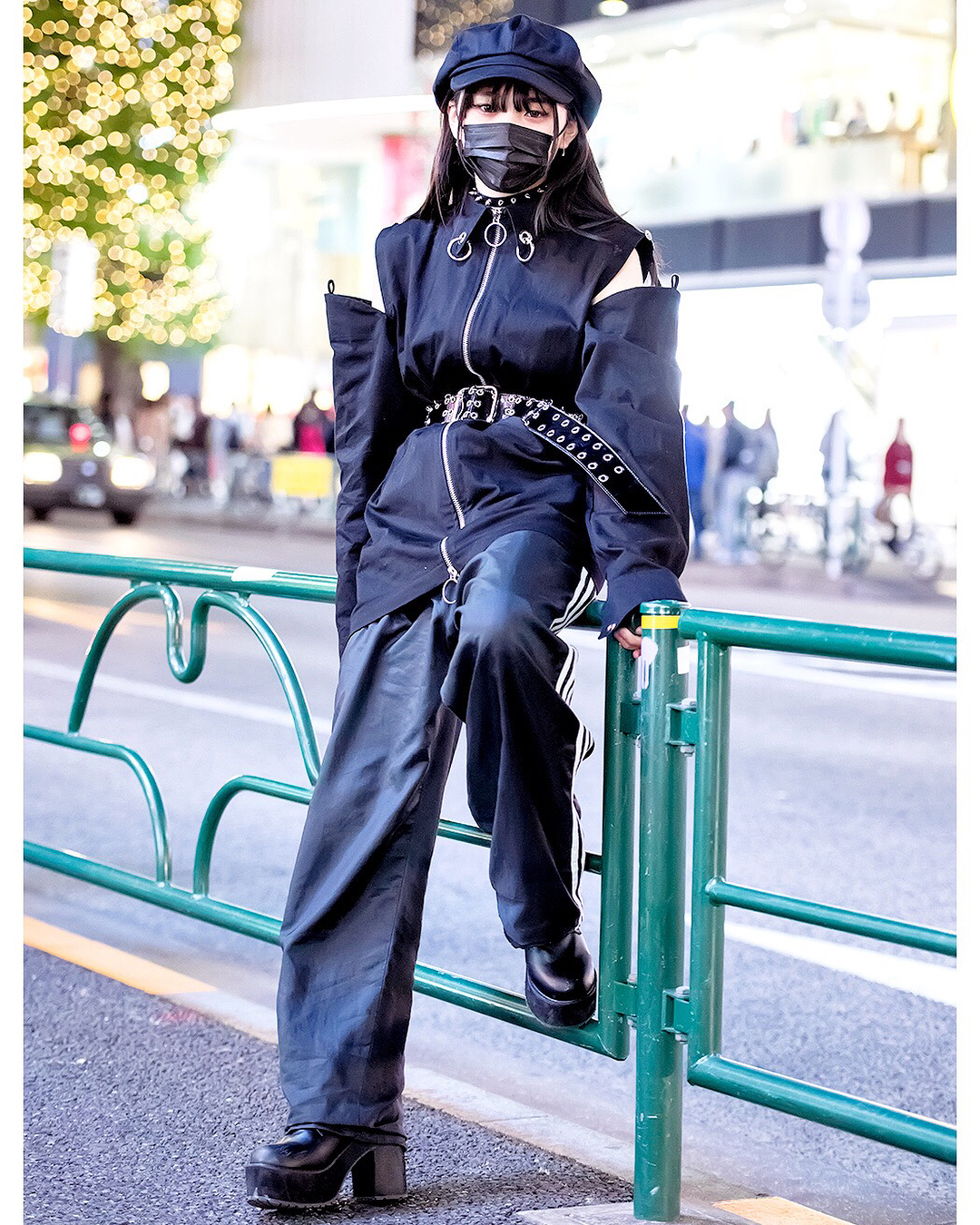 14-year-old Kaya (@kaya127s) on the street in Harajuku wearing a black face mask, a belted cut out shoulder top from Japanese streetwear boutique Nevermind The XU, Adidas pants, and platform zipper boots.