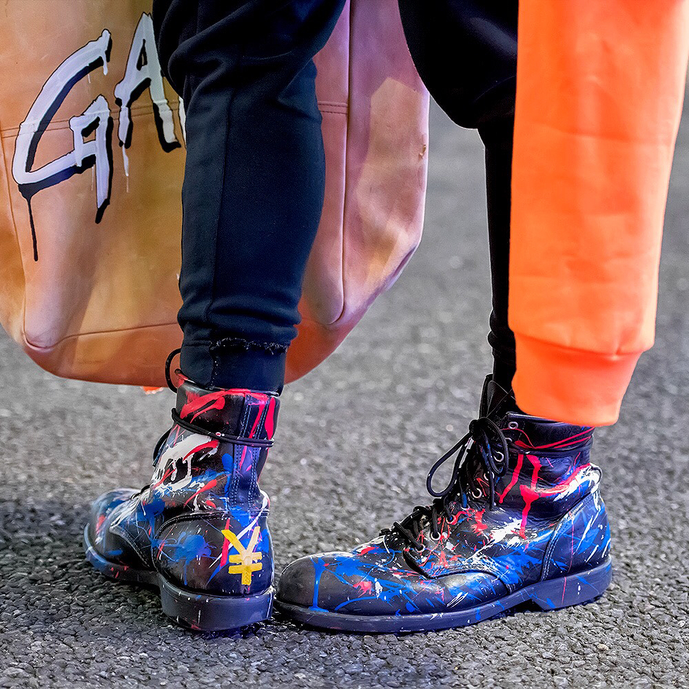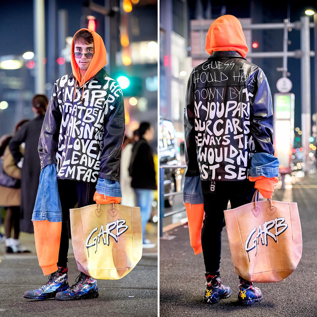 Jacob – the designer of Los Angeles fashion brand Garb (@GarbOfficial) – on the street in Harajuku wearing a Garb “Little Red Corvette” Prince lyrics painted jacket, a Garb remake hoodie, Garb hand painted sneakers, vintage sunglasses, and Garb graffiti tote bag. Garb has a popup shop (@uggla_jp) at LaForet Harajuku 2nd floor until January 4, 2018 – check it out if you’re in Tokyo!