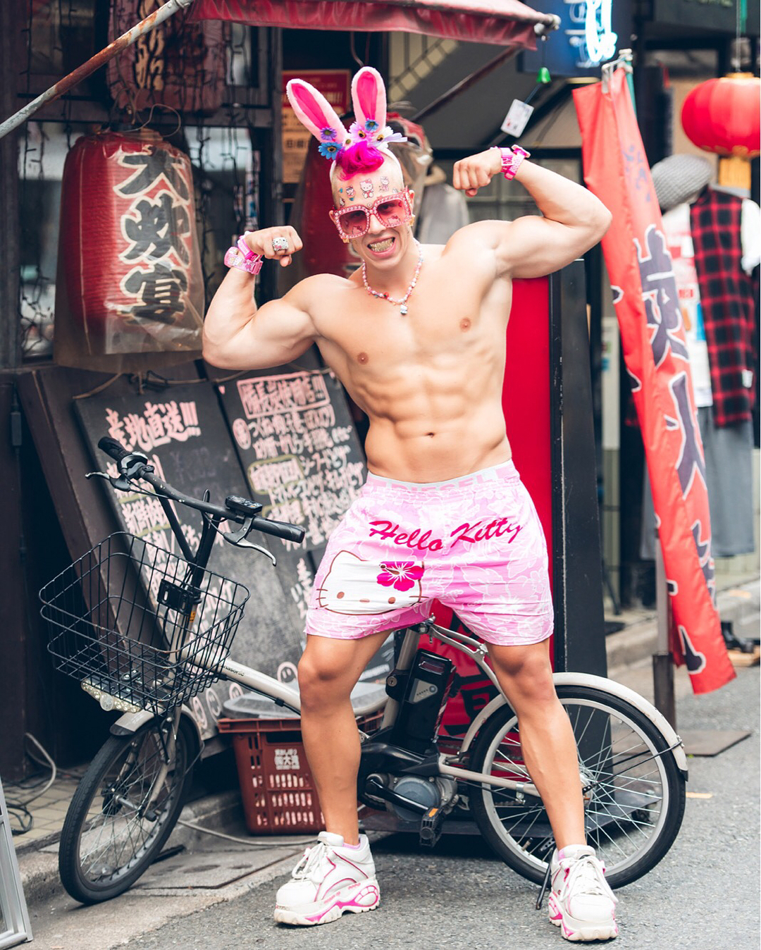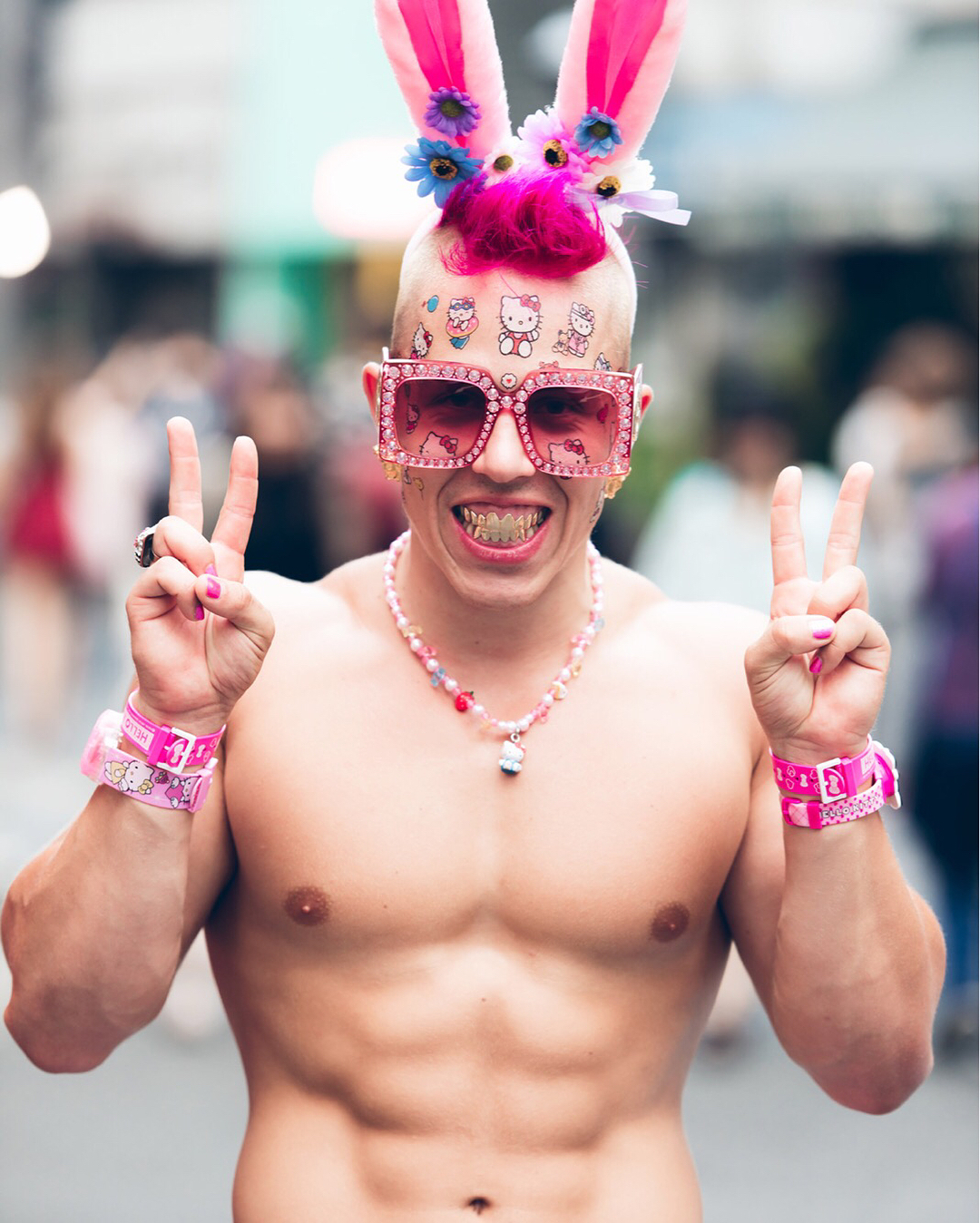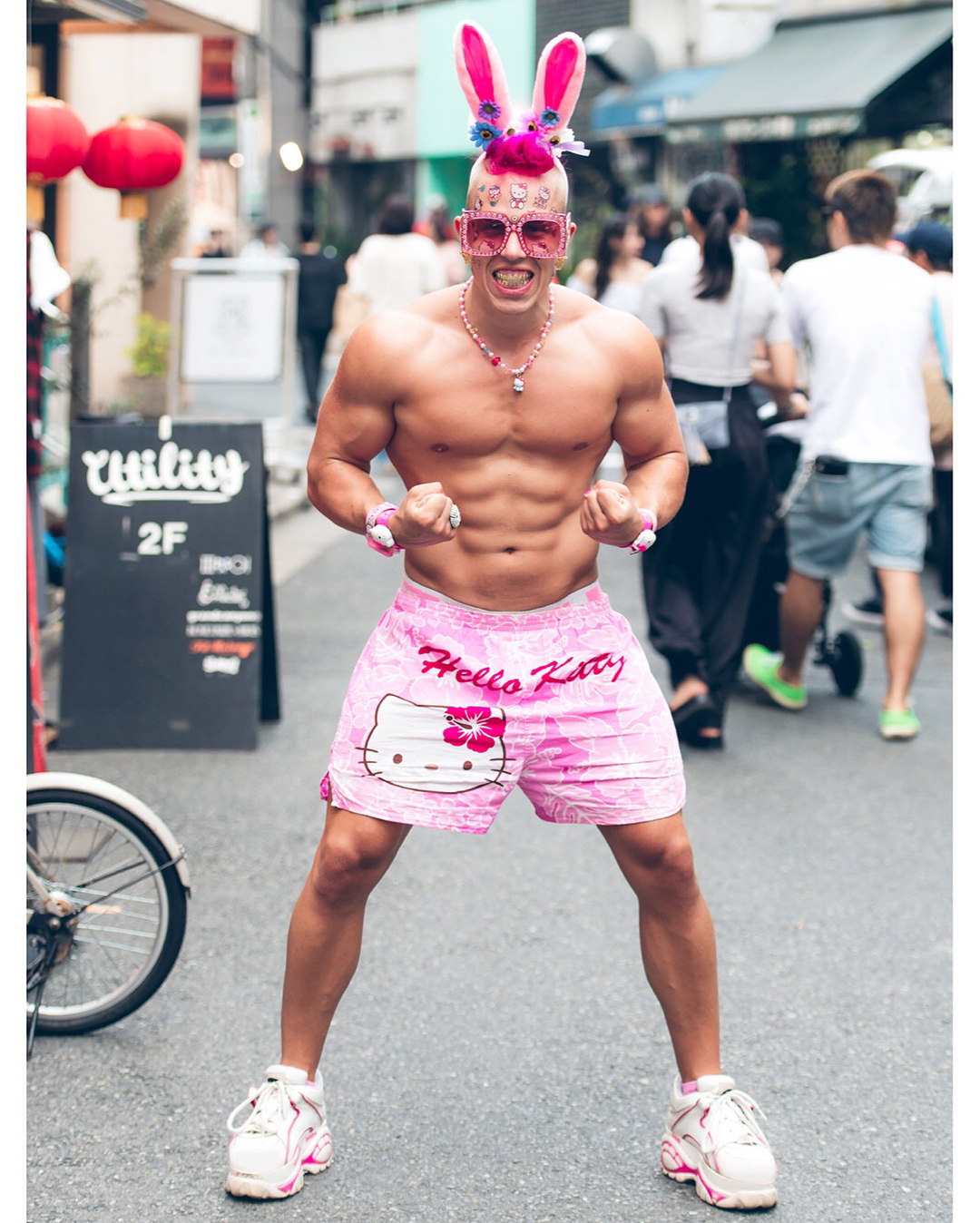 Austrian performance artist Candy Ken (@CandyKen69) on the street in Harajuku wearing pink Hello Kitty fashion, bunny ears, and grills. Tokyo FashionAloJapan.com