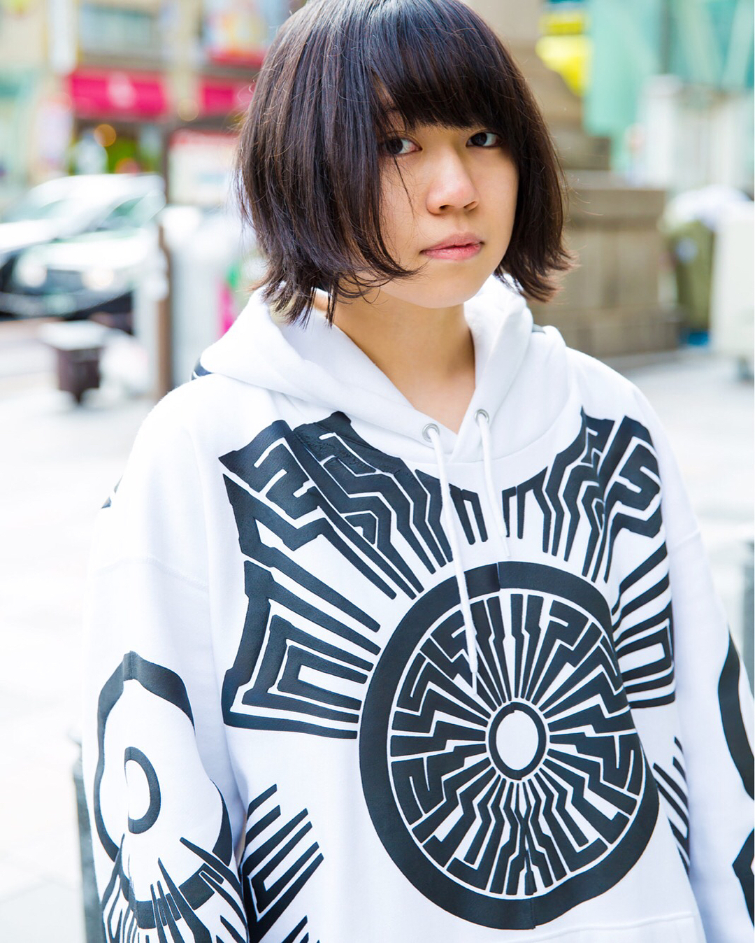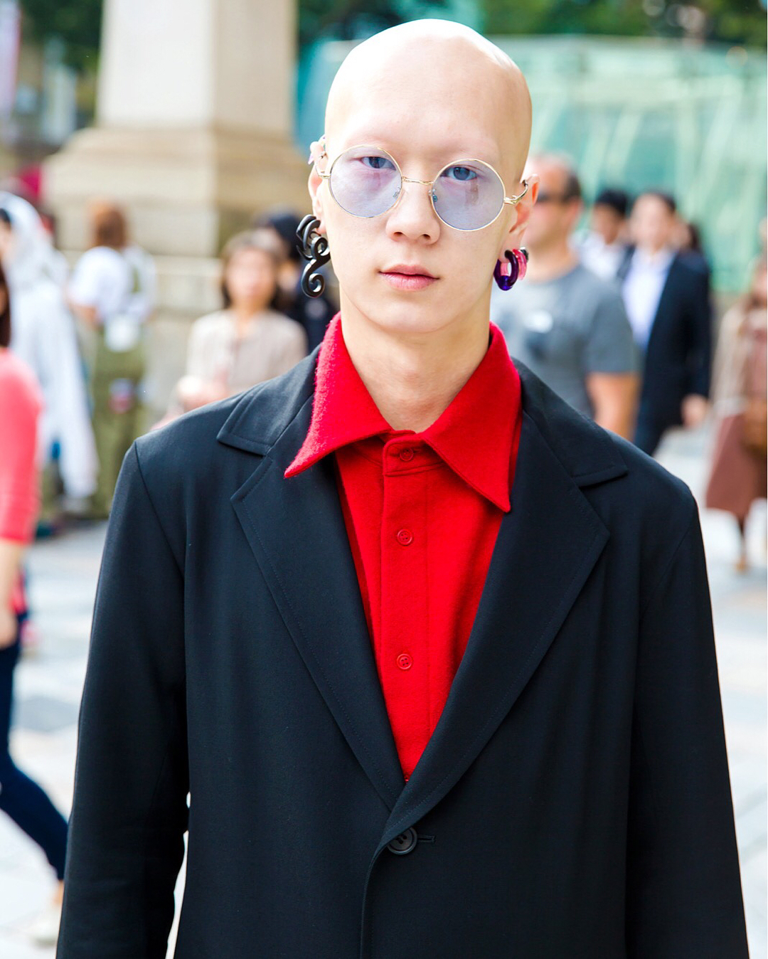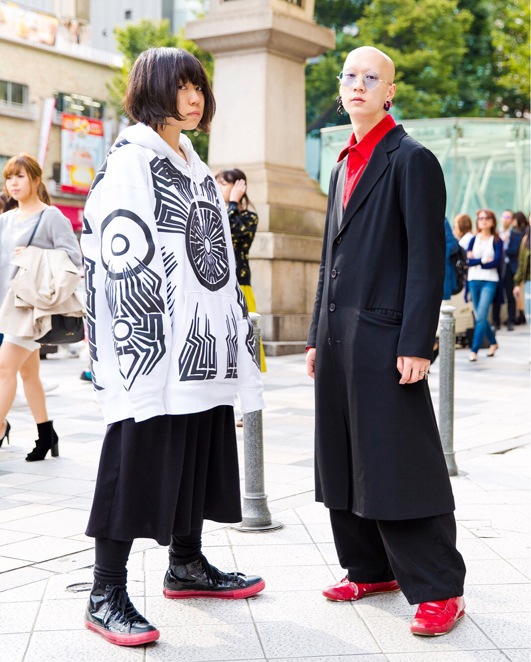 Japanese designer Cue Kitazawa (@ktzw9) and musician Shouta (@tananasho) on the street in Harajuku wearing monochrome fashion with red accents from Zomu, Yohji Yamamoto, Vivienne Westwood, and Converse.