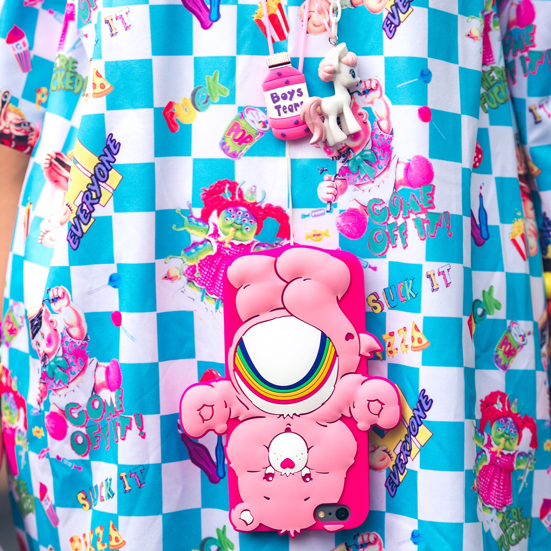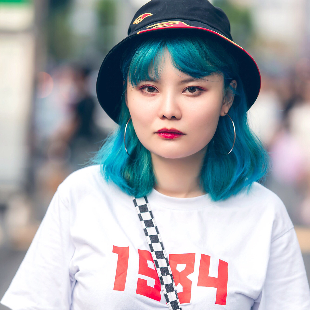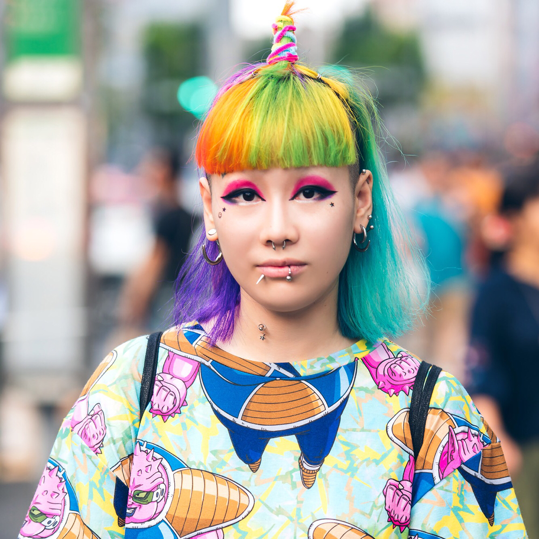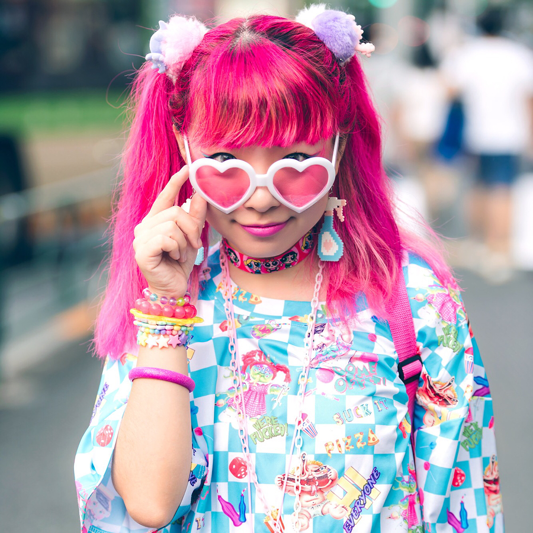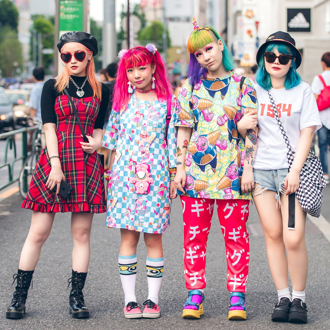 Kathy (@littlesiskathy), Plasticandy (@_plasticandy_), Syouka (@382syouka914), and Vinci on the street in Harajuku wearing colorful kawaii fashion by Sagi Dolls, Vivienne Westwood, Powerpuff Girls, Galaxxxy, Gosha Rubchinskiy, Dead End Kids, Yosuke, Tokyo Bopper, and Gucci.