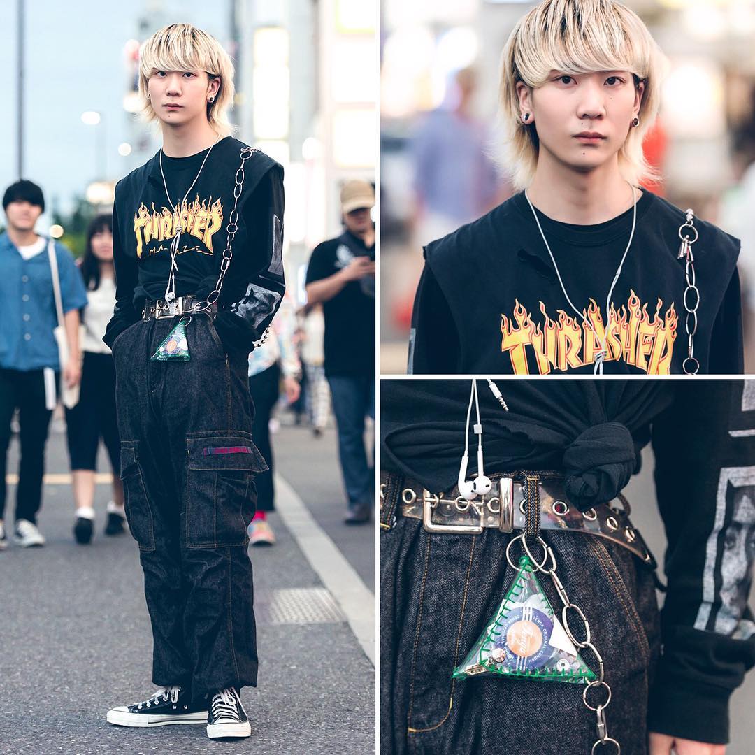 Daiki (@daiki_1998) on the street in Harajuku wearing a sweatshirt by the Japanese streetwear brand Caveat Emptor under a Thrasher vest, baggy Polo Ralph Lauren pants, Converse sneakers, and a transparent Yuma Shimazaki belt bag.