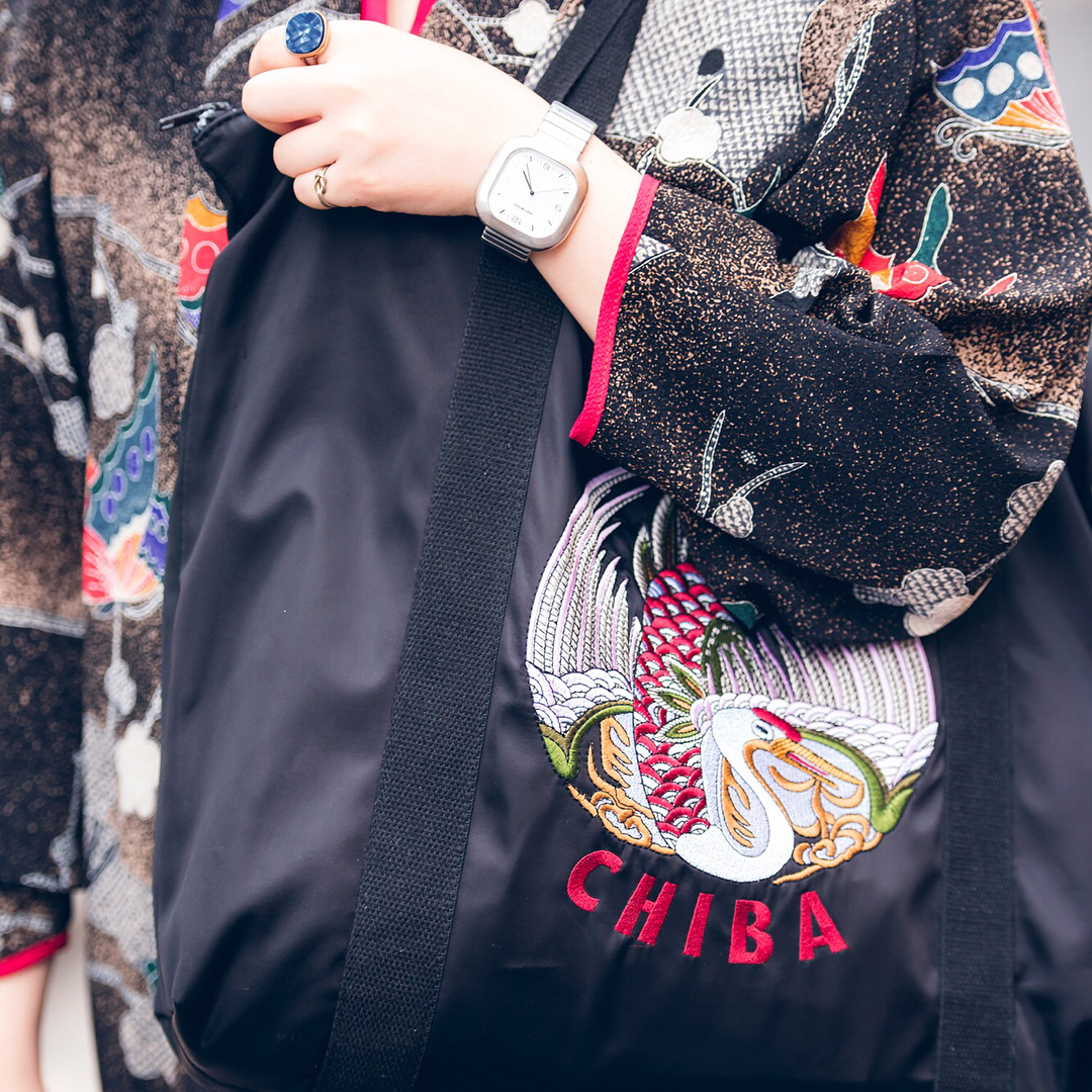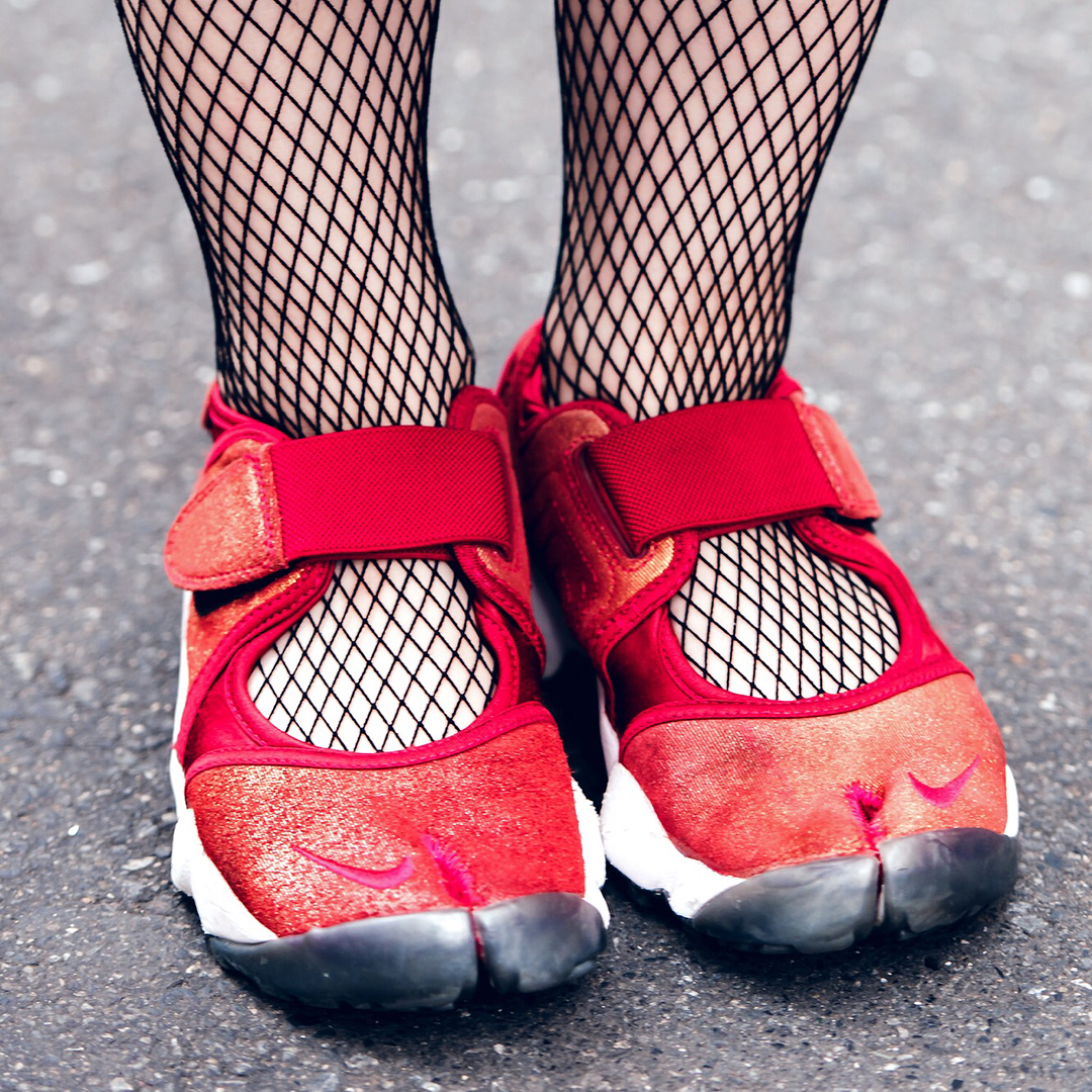 Japanese fashion student Misaki (@toi_et_moi_m) on the street in Harajuku wearing vintage fashion along with split toe Nike sneakers, a choker, and sukajan bag.