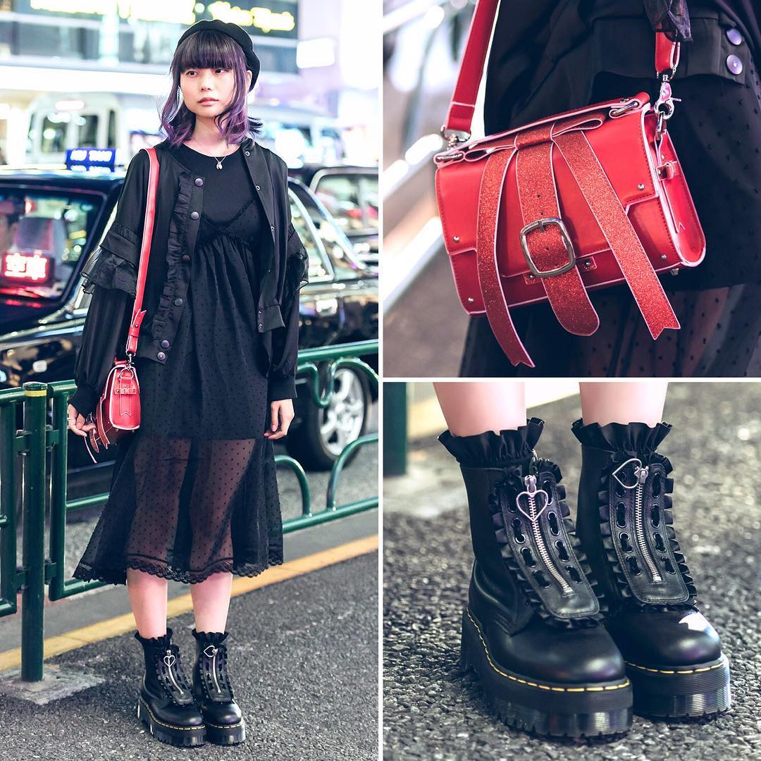 Haluna (@halpaca25) on the street in Harajuku wearing layered all black fashion from Bubbles, E Hyphen World Gallery BonBon, and Nadia along with Dr. Martens zipper boots & Candy Stripper purse. Her favorite singer is Kyary Pamyu Pamyu.