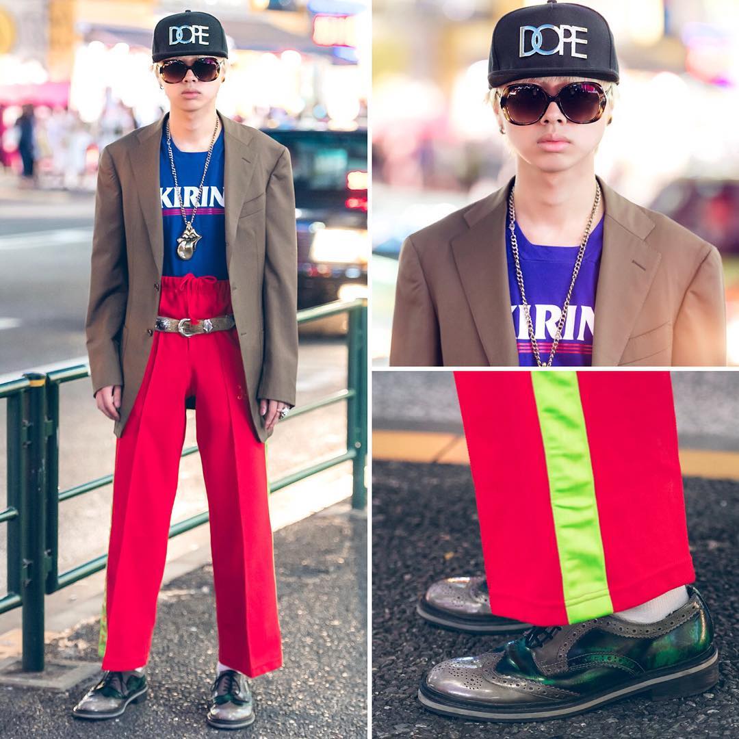 19-year-old Japanese fashion student Raw (@lifecoming1) in Harajuku wearing a vintage street style with a blazer, Kirin shirt, striped pants, wingtip shoes, a Rolling Stones lips necklace, and Christian Dior accessories.