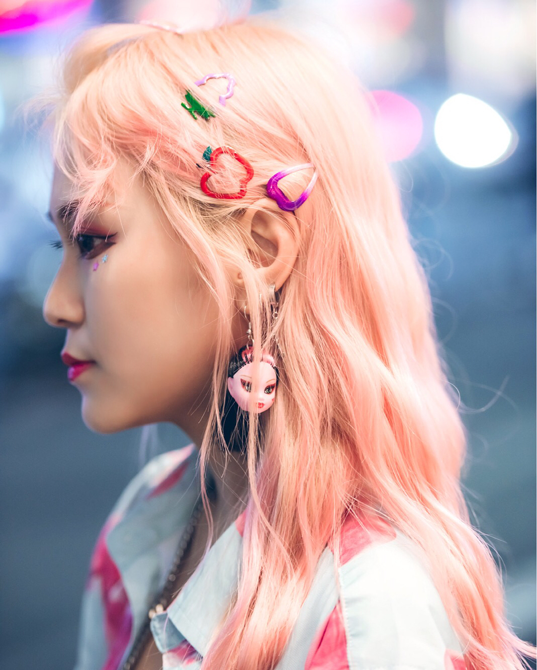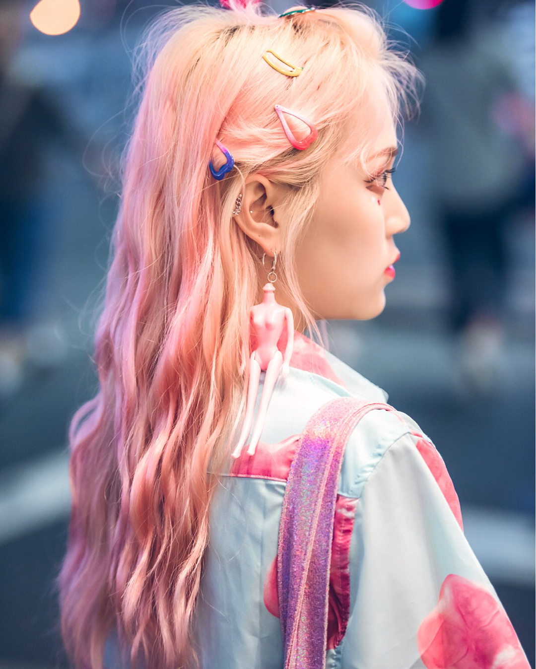 Students Shin-Ping (@3.1in5) and Zhao Zi (@zzzzzzzzzztttt) wearing matching pastel looks on the street in Harajuku with doll parts accessories and Nike Air Max sneakers.