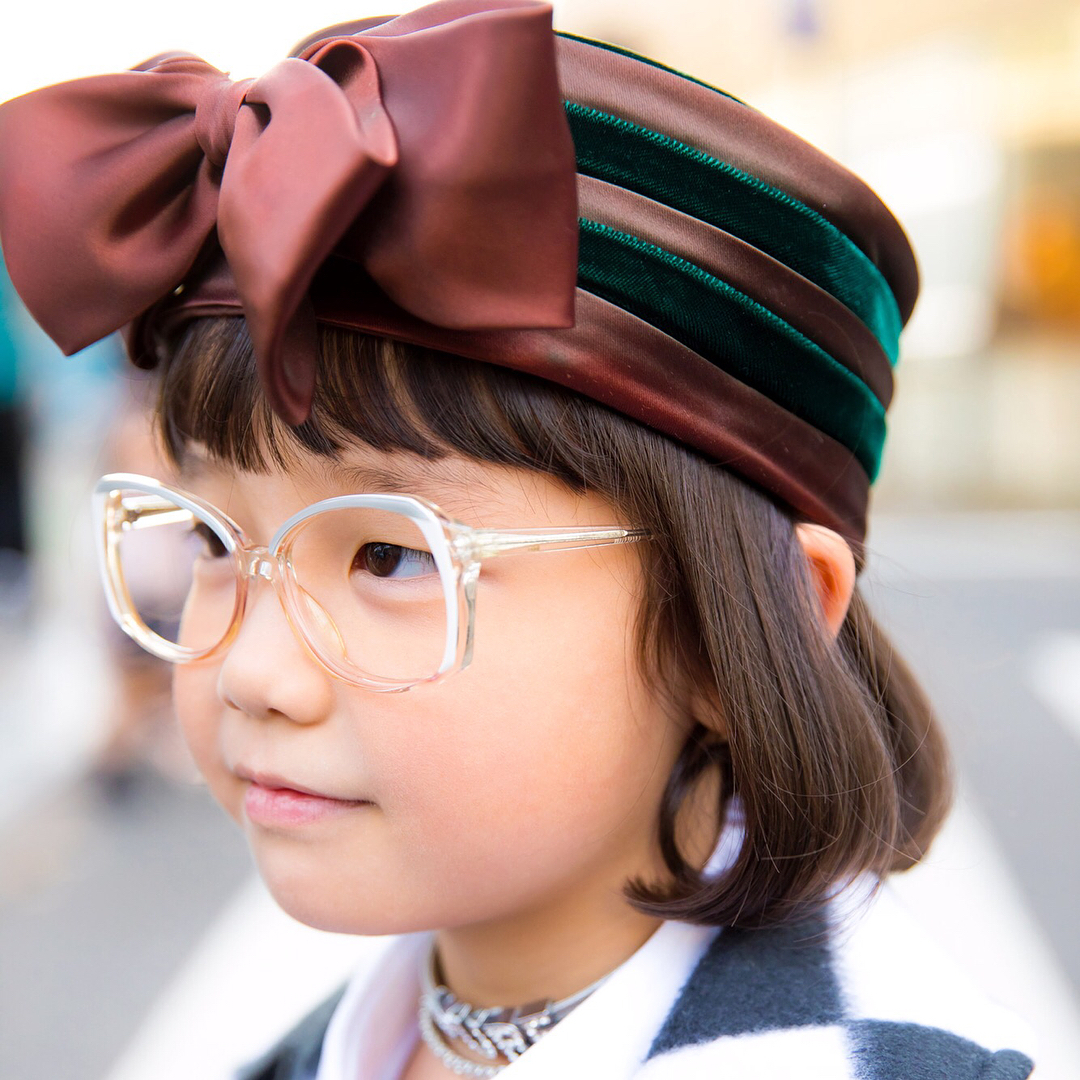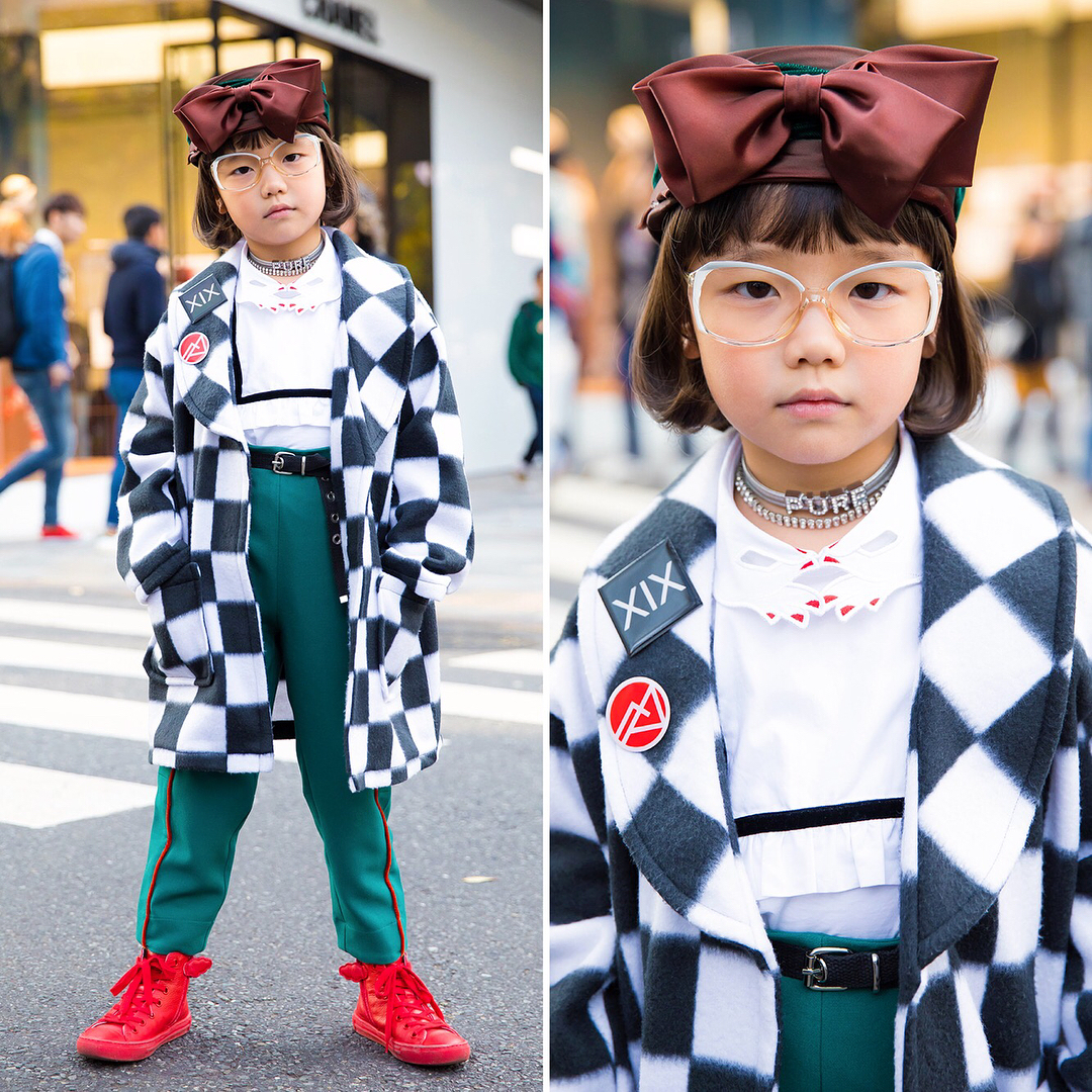 7-year-old Japanese street style personality @Coco_PinkPrincess on the street in Harajuku wearing a Leni and June coat over a Vivetta shirt, green pants by The Animals Observatory, Gucci sneakers, Gosha pins, a Funktique “PURE” choker, and a vintage bow hat. This street snap was taken in front of the Chanel building in Harajuku.