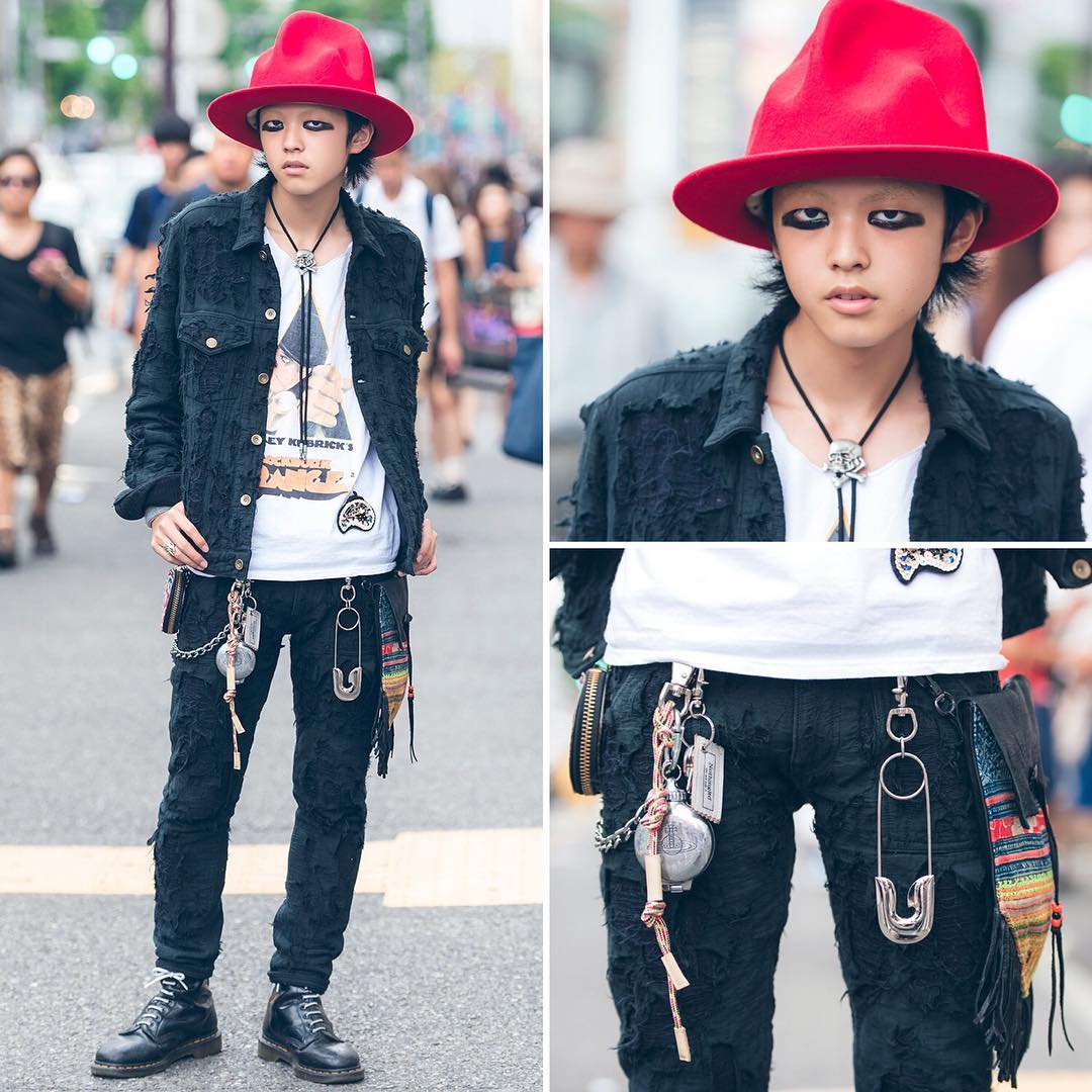 Japanese high school student Nashu (@n___s___u) on the street in Harajuku wearing a distressed denim jacket and matching pants by the Japanese brand Blackmeans, a vintage A Clockwork Orange t-shirt, Vivienne Westwood accessories, and Dr. Martens boots.