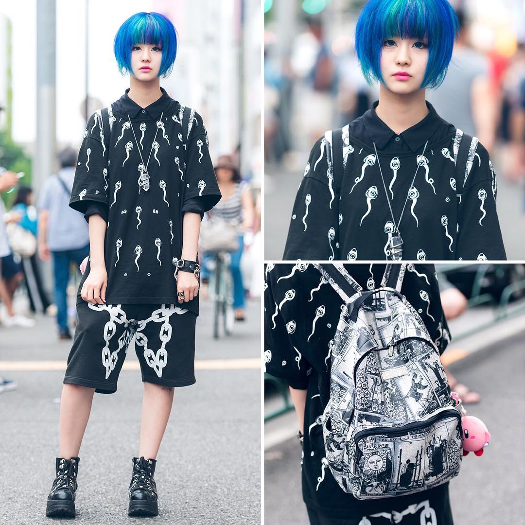 20-year-old Kanna ( @lv.666 ) on the street in Harajuku wearing a monochrome look with top and shorts by Far Star, Yosuke USA boots, a Killstar backpack, and Killstar accessories. Her favorite bands are Vamps and L’Arc-en-Ciel.