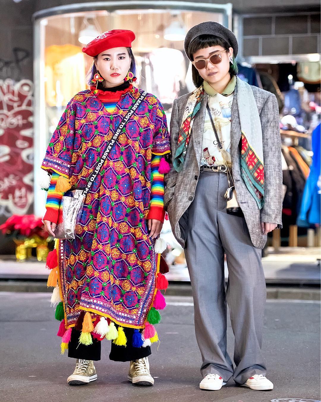 Malaysian fashion designers Beeyin (@beeyintan) and Li Fang (@ylflifang) on the street in Harajuku wearing a colorful tunic from Chiang Mai and Converse sneakers vs. a vintage gray suit and Vans sneakers.