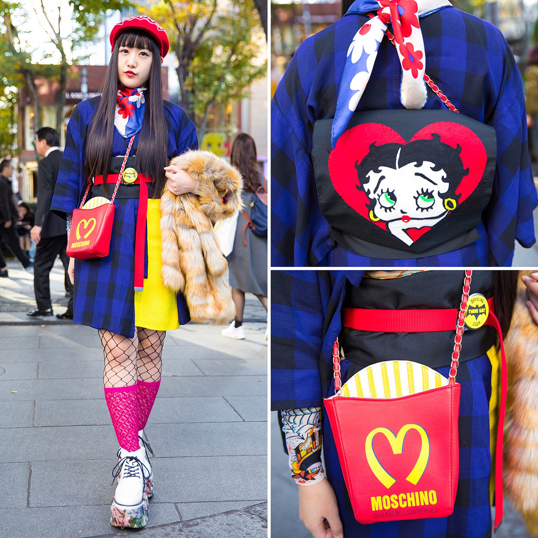 17-year-old Merica (@mjceeo) on the street in Harajuku wearing a fun look with plaid kimono that she bought online, DIY Betty Boop obi, remake floral platform shoes, a vintage knit cap, and a McDonald’s french fries purse by Moschino.