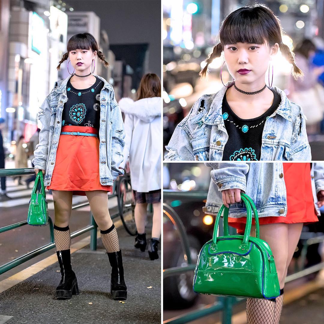 20-year-old Kaori (@hyan15_) on the street in Harajuku wearing an oversized acid wash jacket and turquoise embellished shirt from the Harajuku vintage shop Punk Cake with a Faith Tokyo skirt, Bubbles Harajuku platform zipper boots, and an X-Girl handbag.