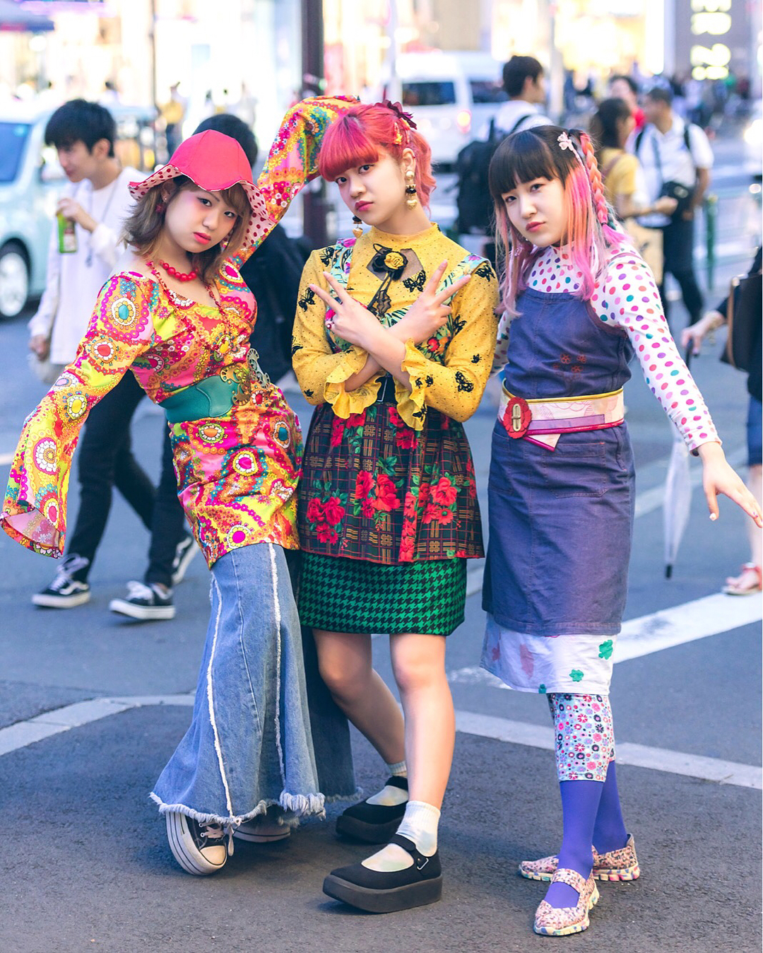 Japanese fashion college students – and publishers of @Fanatic__Tokyo Magazine – Haruka (@harukakado), Rizna (@i_rizna), and Fuki (@tsuppashiru_) on the street in Harajuku wearing colorful mixed prints vintage styles with items from Big Time, Petit Cochon, Tokyo Bopper, Nadia Harajuku, Swimmer, Juxtaposition, DaiDai, and many more.