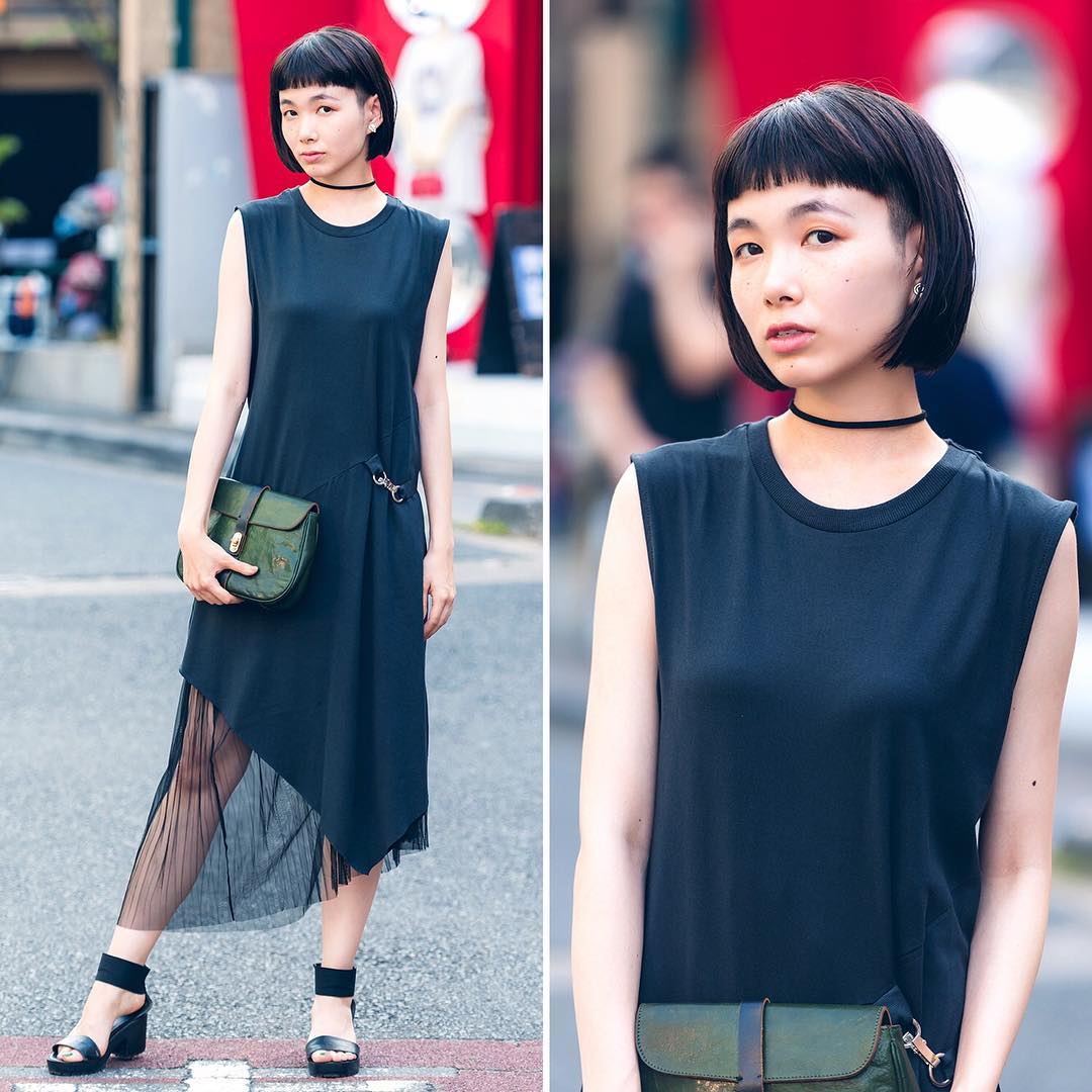 Japanese model Chiho (@chiho_068) on Cat Street in Harajuku wearing a minimalist look with a Zara dress, H&M sheer skirt, Marni clutch bag, and Christian Dior accessories.