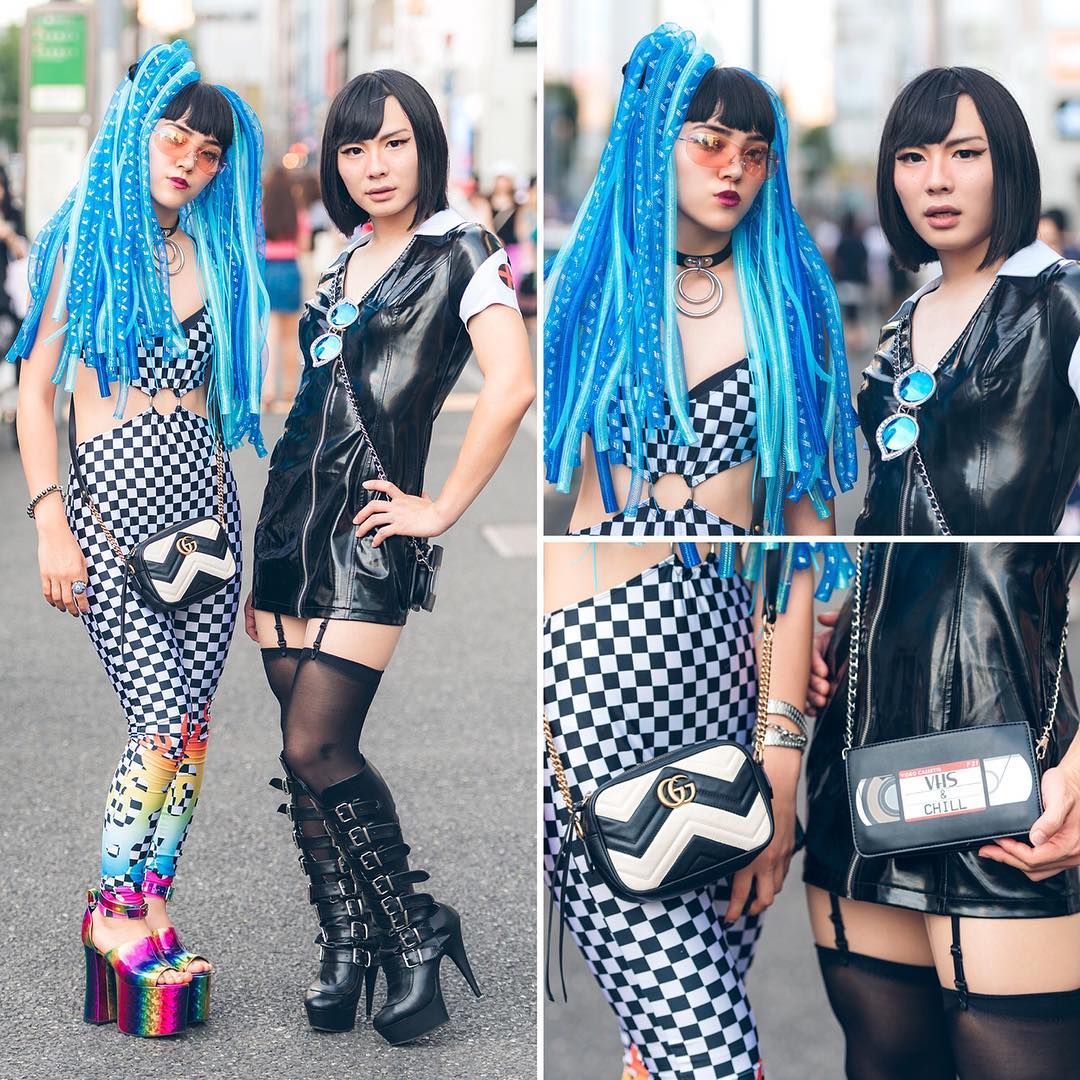 Fashion students Cathy (@george_cathy_rina) and Gagachin (@gagachin_chin) on the street in Harajuku wearing clubwear inspired looks featuring items from Dolls Kill, Gucci, YRU, and Pleaser.