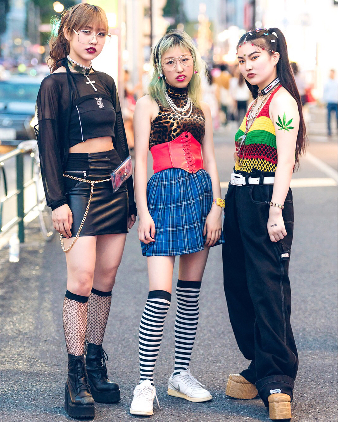 Japanese teens Miyuka (@tom_and_jerrry), Marina (@marincyorin), and Marin (@_m19981102) on the street in Harajuku wearing fashion from Dolls Kill, UNIF, Vidakush, Pikachu, Nakano Ropeway, Pinnap Harajuku, Banny Store, Playboy, Faith Tokyo, and vintage shops. Swipe left for Pikachu!