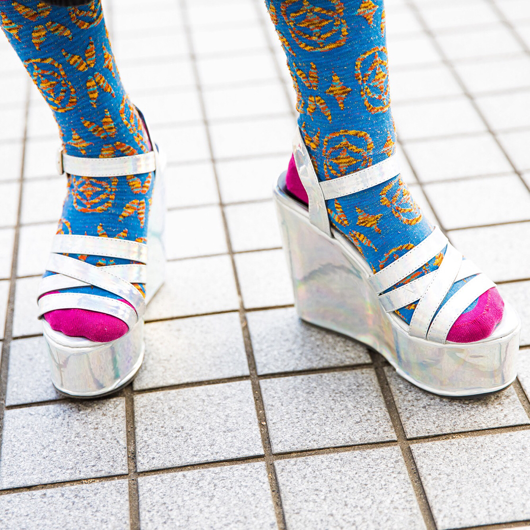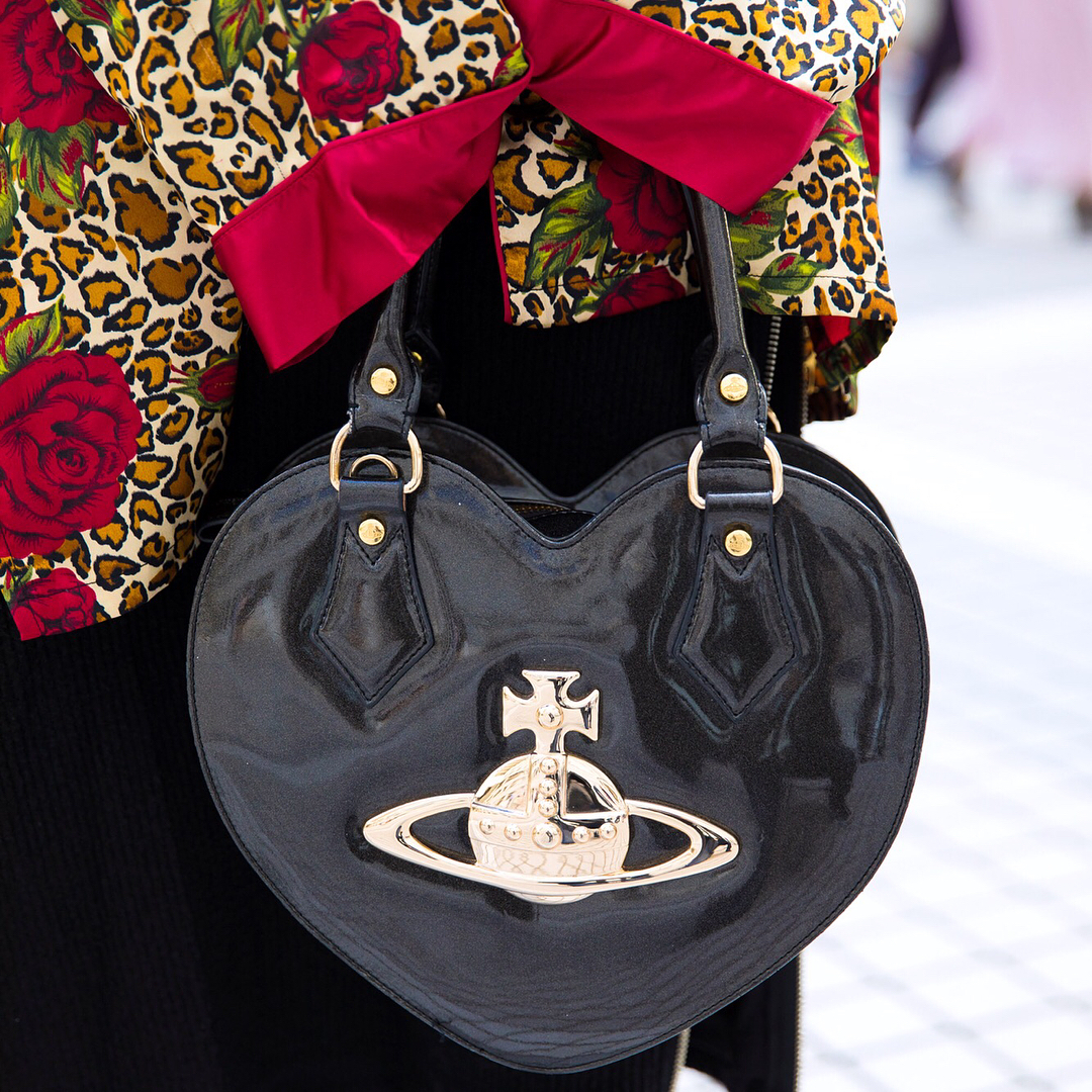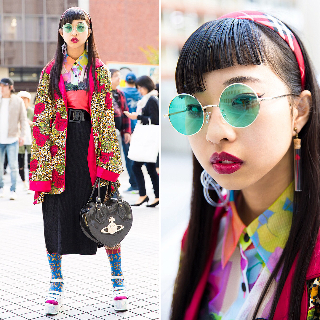 19-year-old Yoshino (@hyscra_______) at Bunka Fashion College in Tokyo wearing a vintage mixed prints street style with a Bubbles Tokyo midi skirt, Bubbles platform sandals, and a Vivienne Westwood heart handbag. Take a close look at the amazing cut of her bangs too.