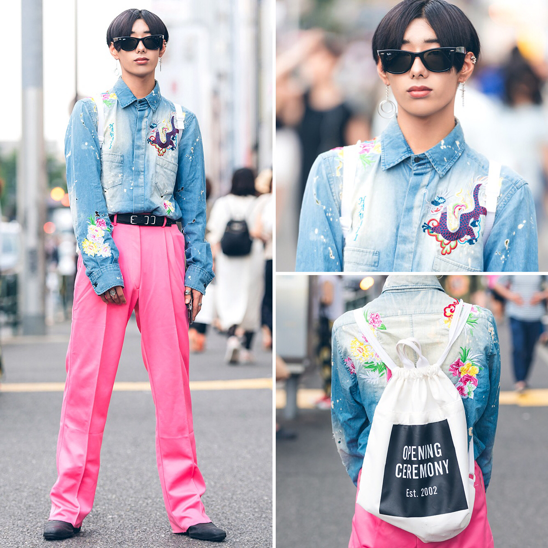 19-year-old @ManayaTsunoda on the street in Harajuku wearing a dragon embroidery denim shirt by D&G with pink pleated pants, a Balenciaga belt, Yosuke USA shoes, and an Opening Ceremony sackpack.