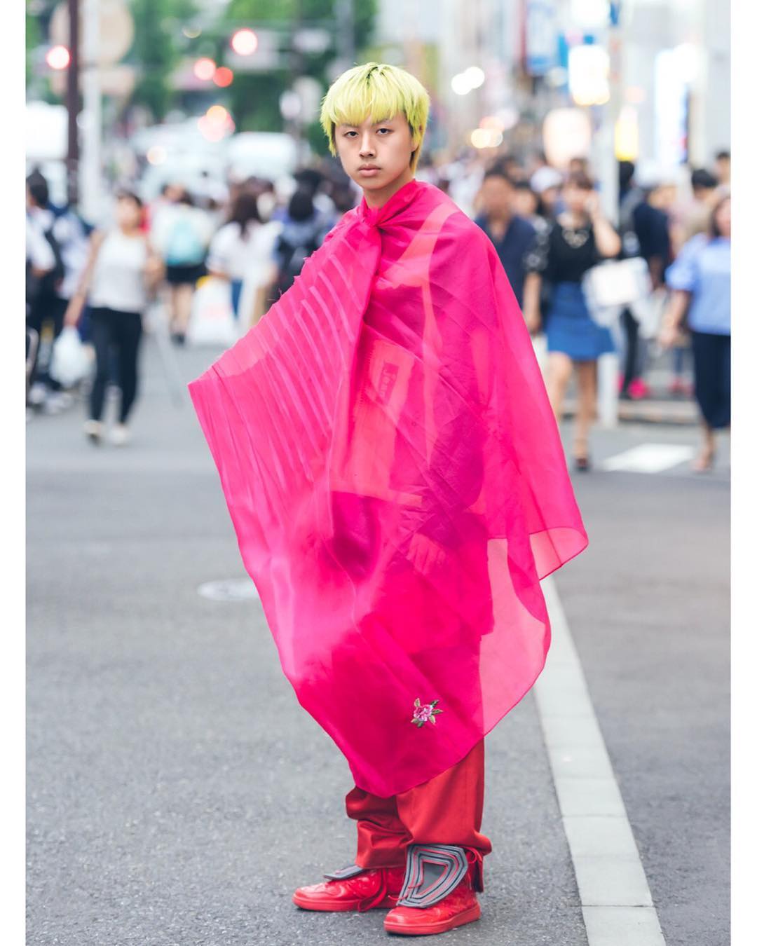 19-year-old Japanese fashion student RAW (@lifecoming1) on the street in Harajuku wearing a handmade pink pleated cocoon cape with sneakers from Happening.