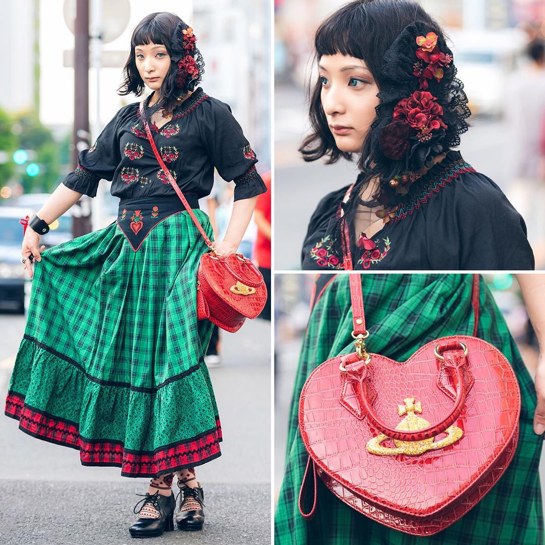 Tiori on the street in Harajuku wearing an embroidered Grapefruit Moon top, a vintage skirt, Yosuke USA heels, a Vivienne Westwood heart purse, plus accessories from Dangerous Nude and Ayacho.