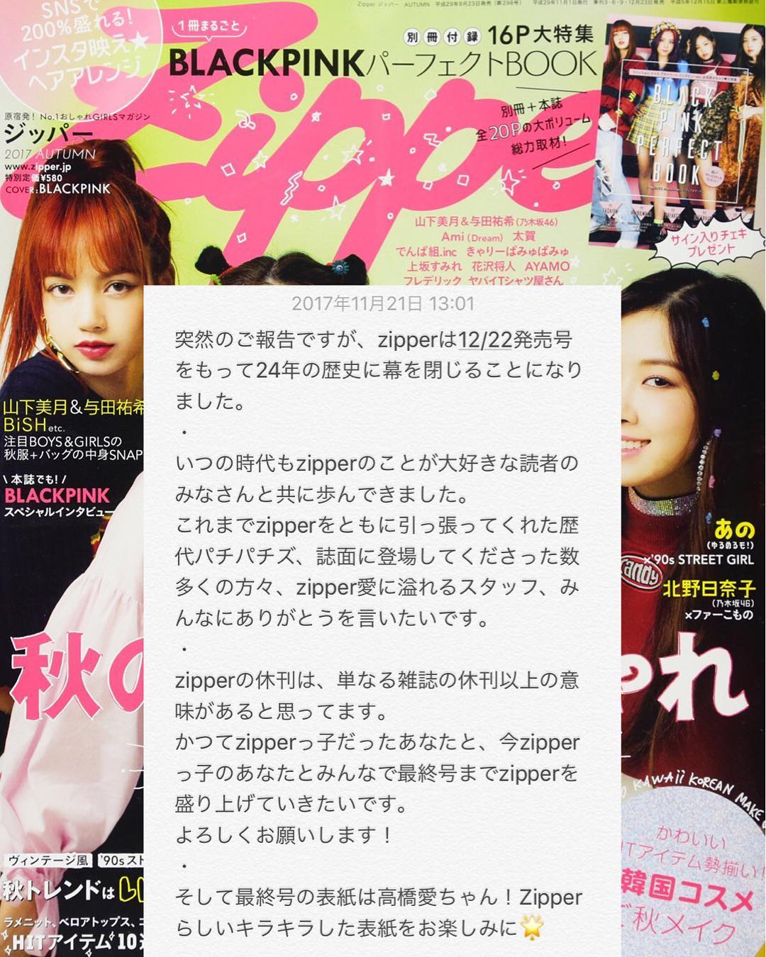 Japanese street fashion magazine Zipper (@ZipperJP) announced today that their December issue will be the final issue. The magazine, which launched in 1993, didn’t give any specific reasons for the closure, but this has been a bad year for Japanese print magazines. In 2017, most people get their information online, not in print format. Goodbye Zipper, thank you for all of the amazing fashion over the years! 🙏🙏