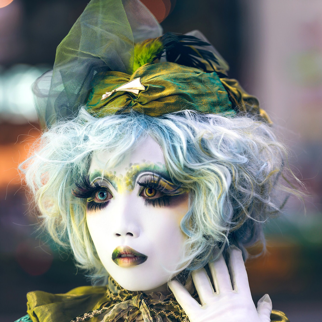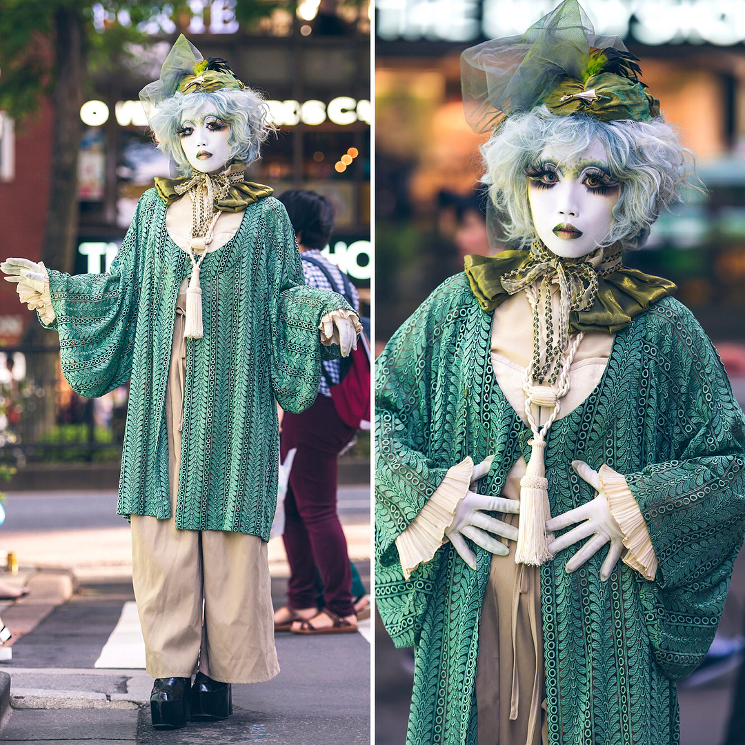 Japanese shironuri artist Minori (@minori00mon) on the street in Harajuku at night wearing vintage and handmade fashion along with hand painted makeup. Tokyo FashionAloJapan.com