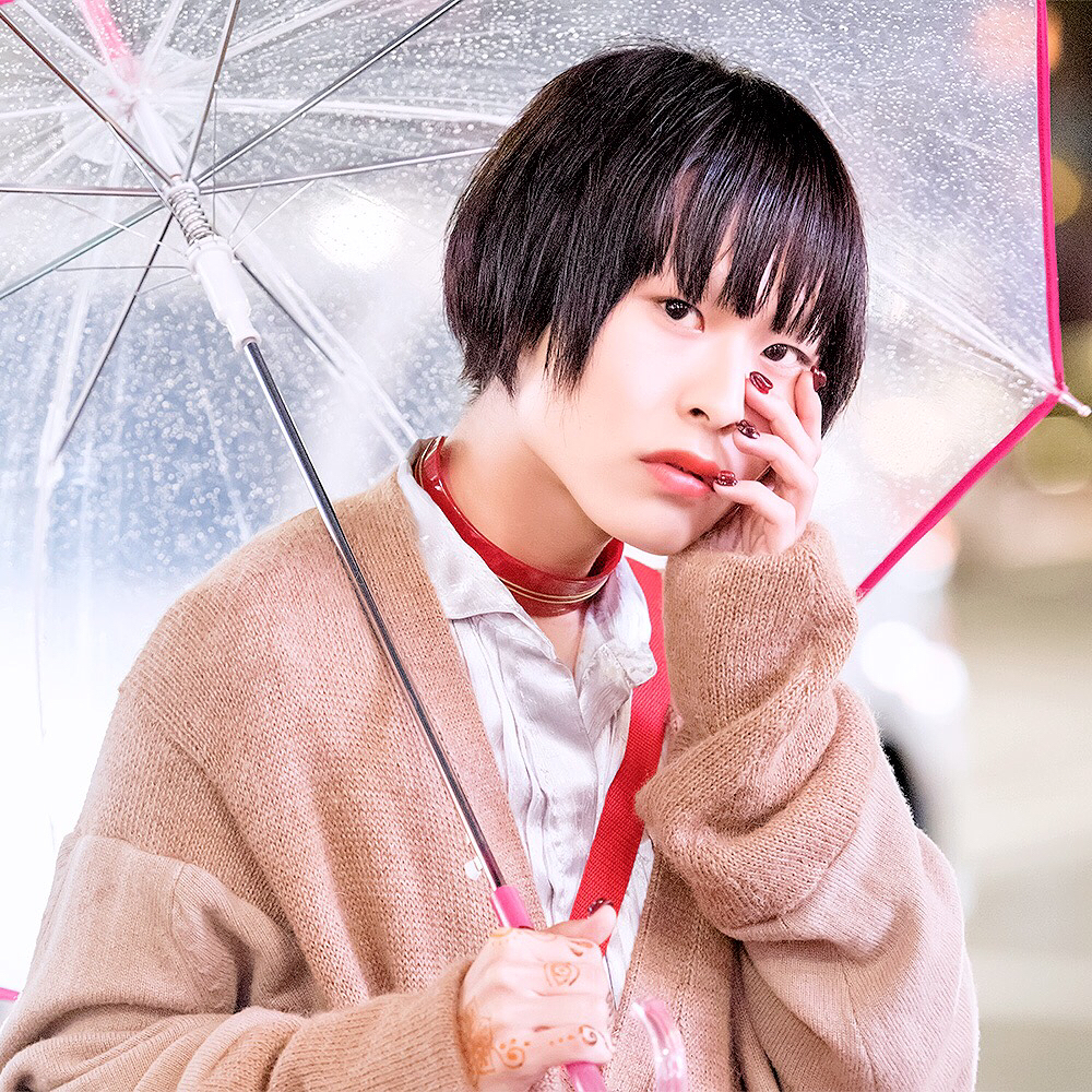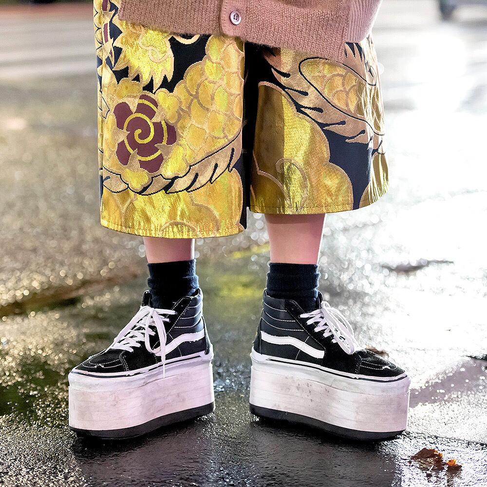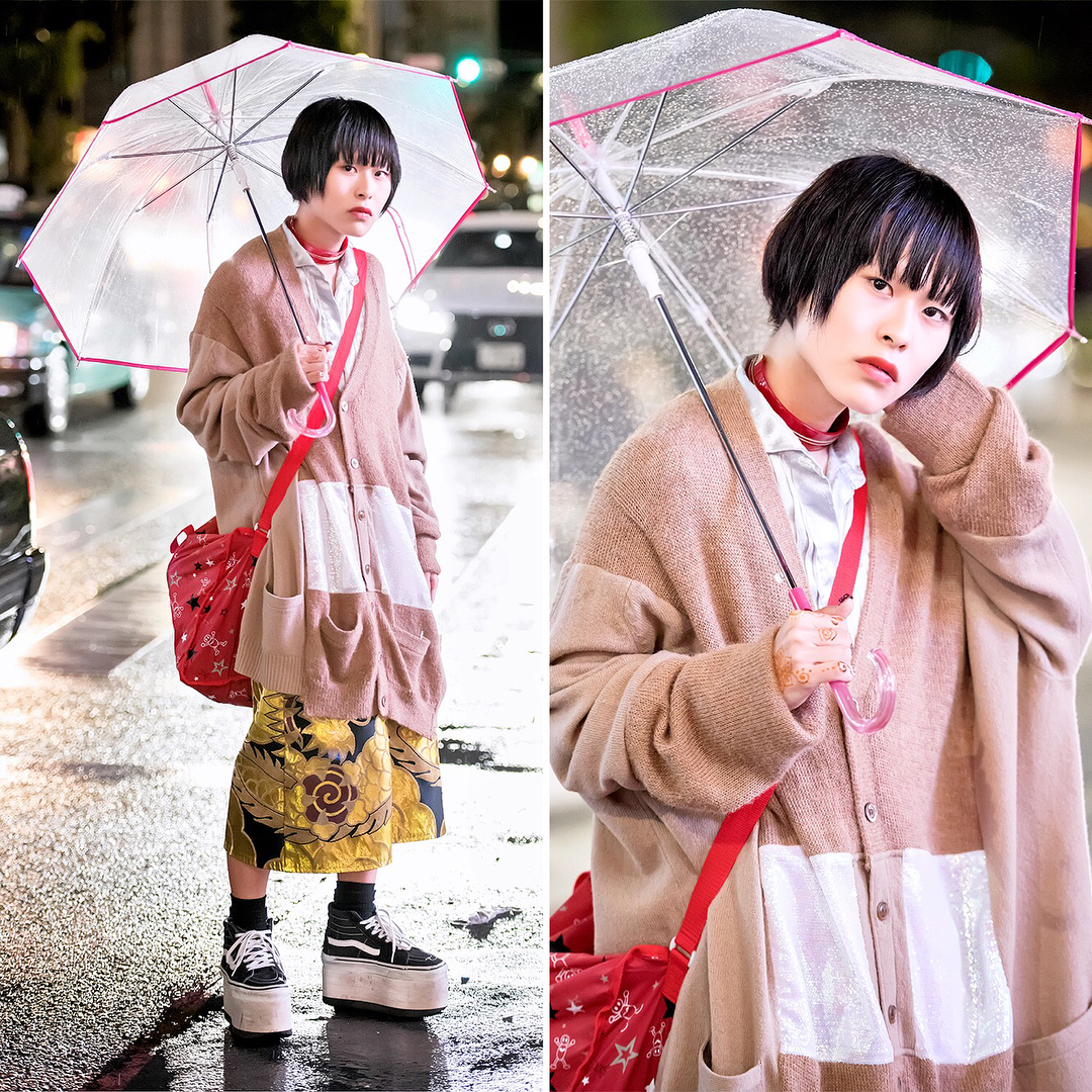19-year-old Japanese fashion school student Nosuke (@no_s_ke) on the street in Harajuku in the rain. His look features an oversized Potto cardigan with Zomu brocade shorts and platform Vans sneakers.