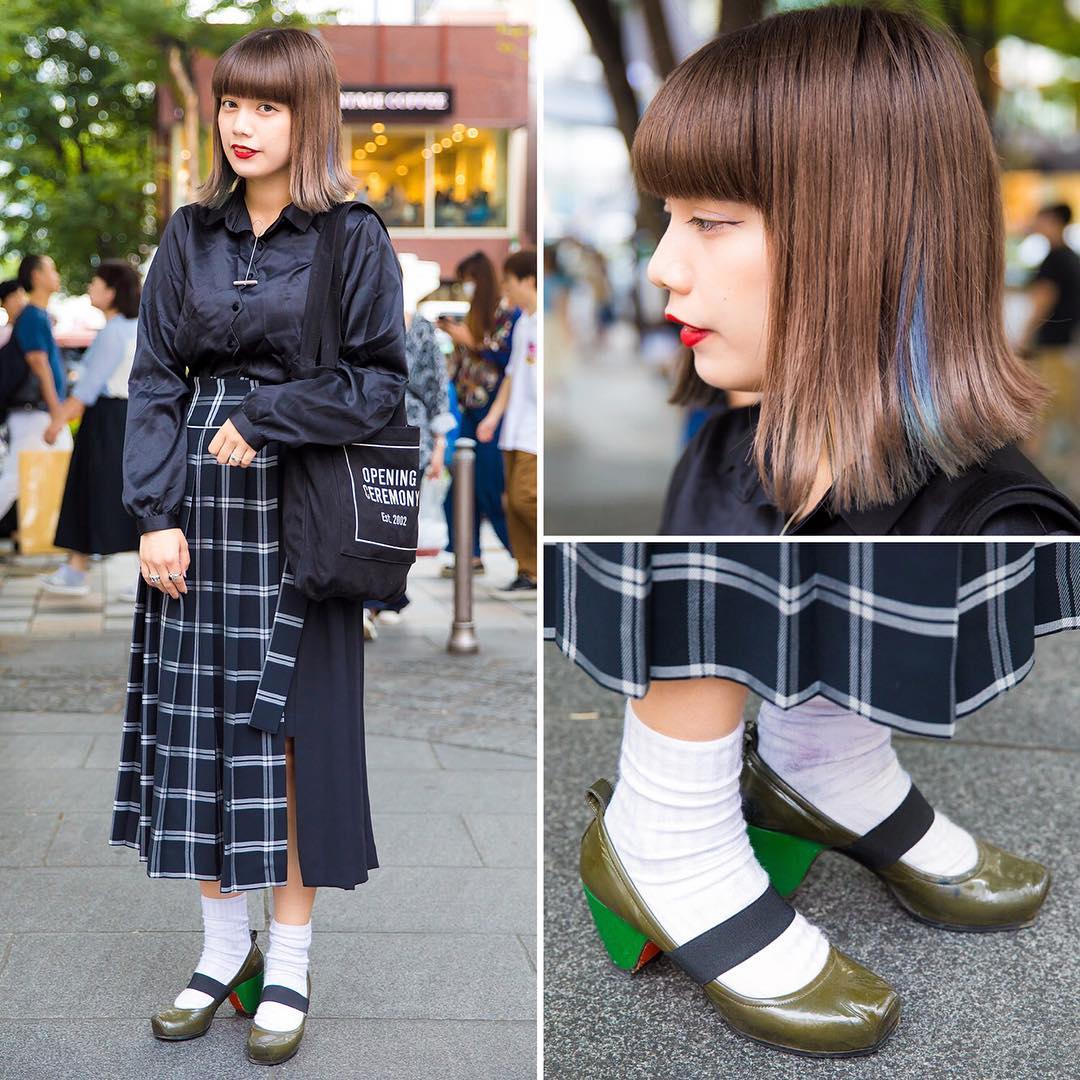 20-year-old Dana on the street in Harajuku wearing a Merry Jenny top, GVGV skirt, Marc Jacobs colorblock heels, Vivienne Westwood jewelry, and an Opening Ceremony tote bag.