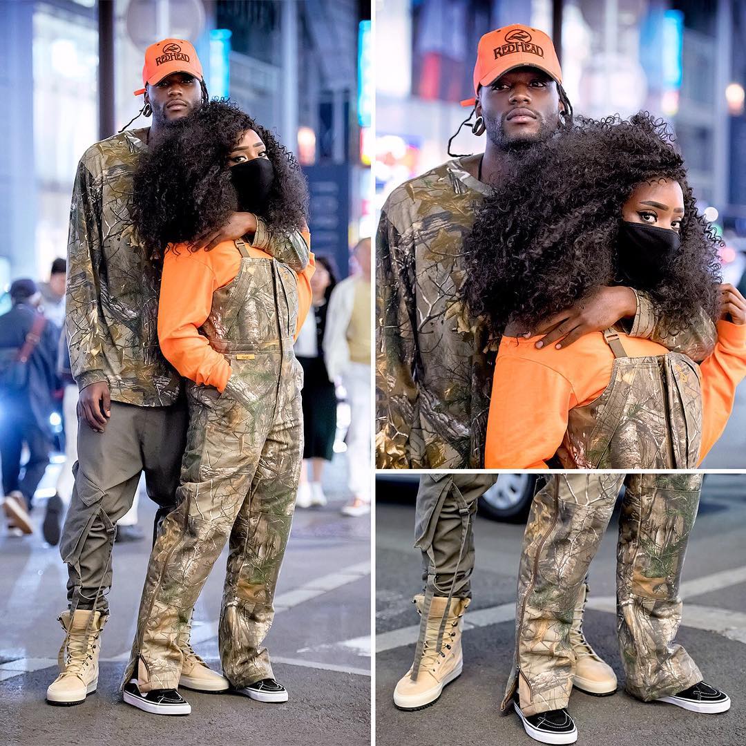 Designer Nene (@nehnehboo) and artist Brahim (@duckduckgousse) on the street in Harajuku wearing matching hunting gear inspired looks including camouflage by She, a Redhead cap, and Vans sneakers.