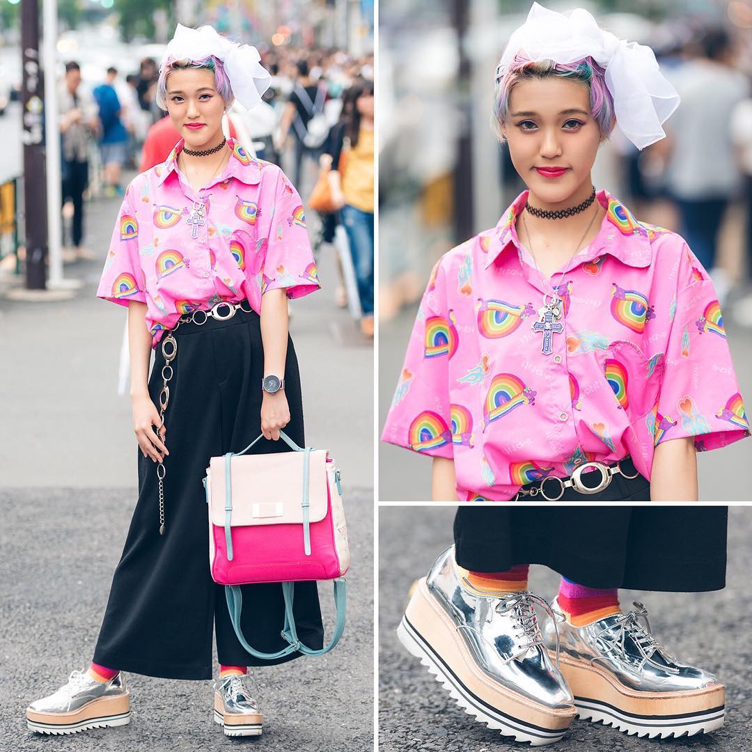 Rikarin (@rikarin0526) on the street in Harajuku wearing a CawaiiTillIDie rainbows shirt, vintage wide leg pants from Kinji Harajuku, Happy Socks rainbow socks, silver Jeffrey Campbell platforms, a pastel Philosophy bag, and Amijed jewelry.