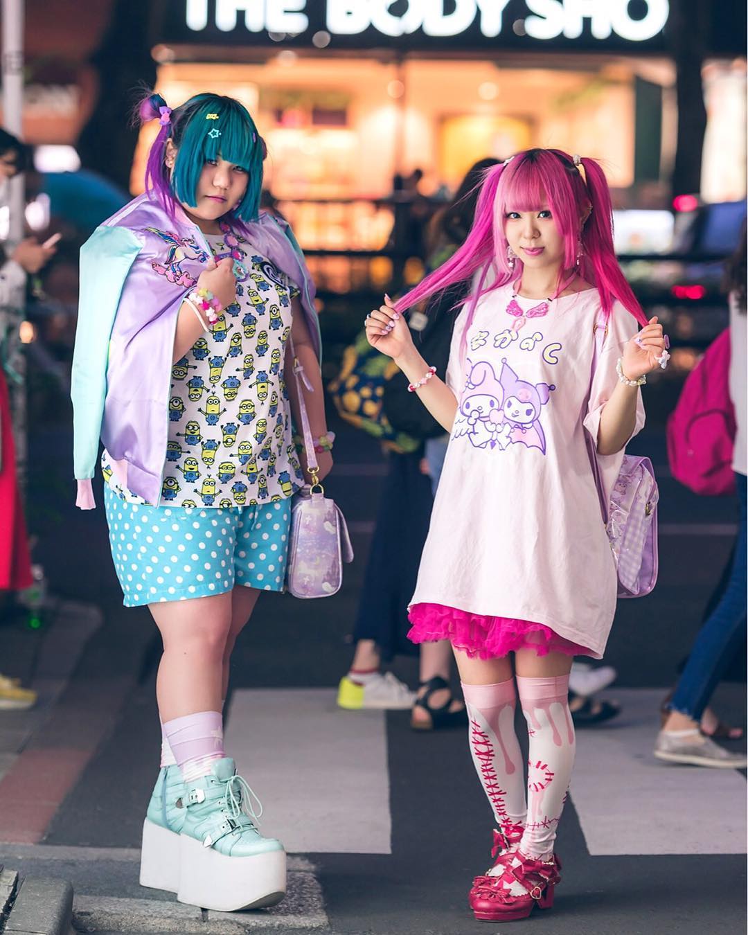 Kawaii-loving Harajuku girls Yamazaki2gou (@yamazaki2gou) and Sebone (@sebone_dead) on the street after dark wearing colorful fashion from the Japanese brands 6%DOKIDOKI, Cosmic Magicals, Listen Flavor, Super Lovers, Conpeitou, Yosuke, Swimmer, and Metamorphose Temps De Fille.