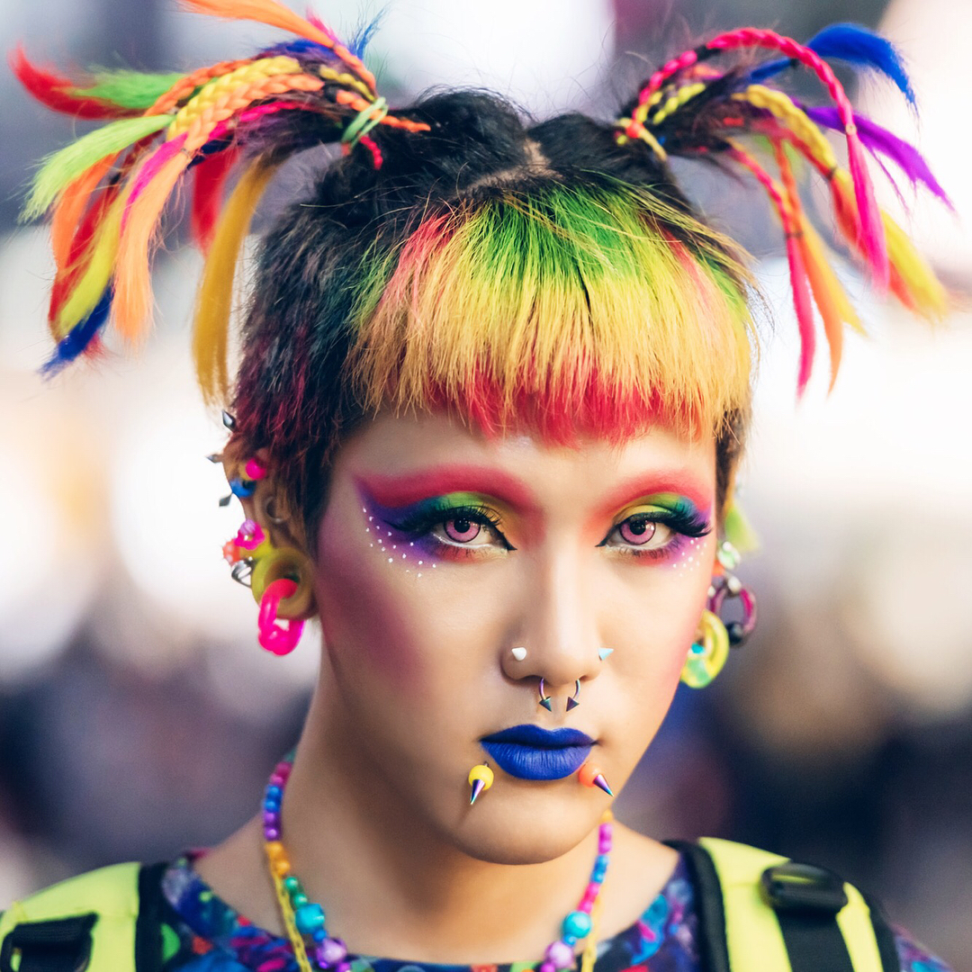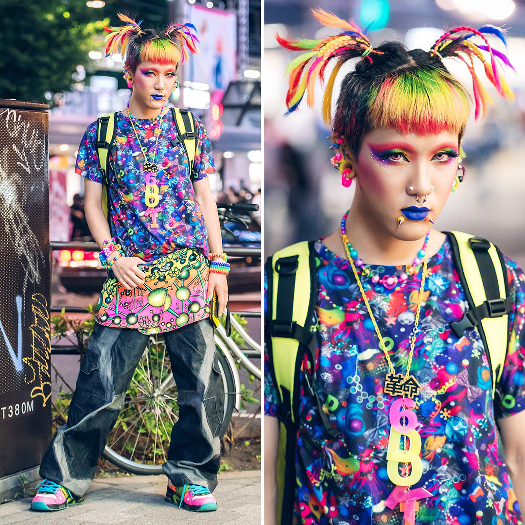 Kanata (@KANATA.CIRCLEK) on the street in Harajuku wearing a colorful 6%DOKIDOKI shirt with a Cyberdog skirt over Space Tribe pants, colorblock sneakers, and 6%DOKIDOKI accessories.