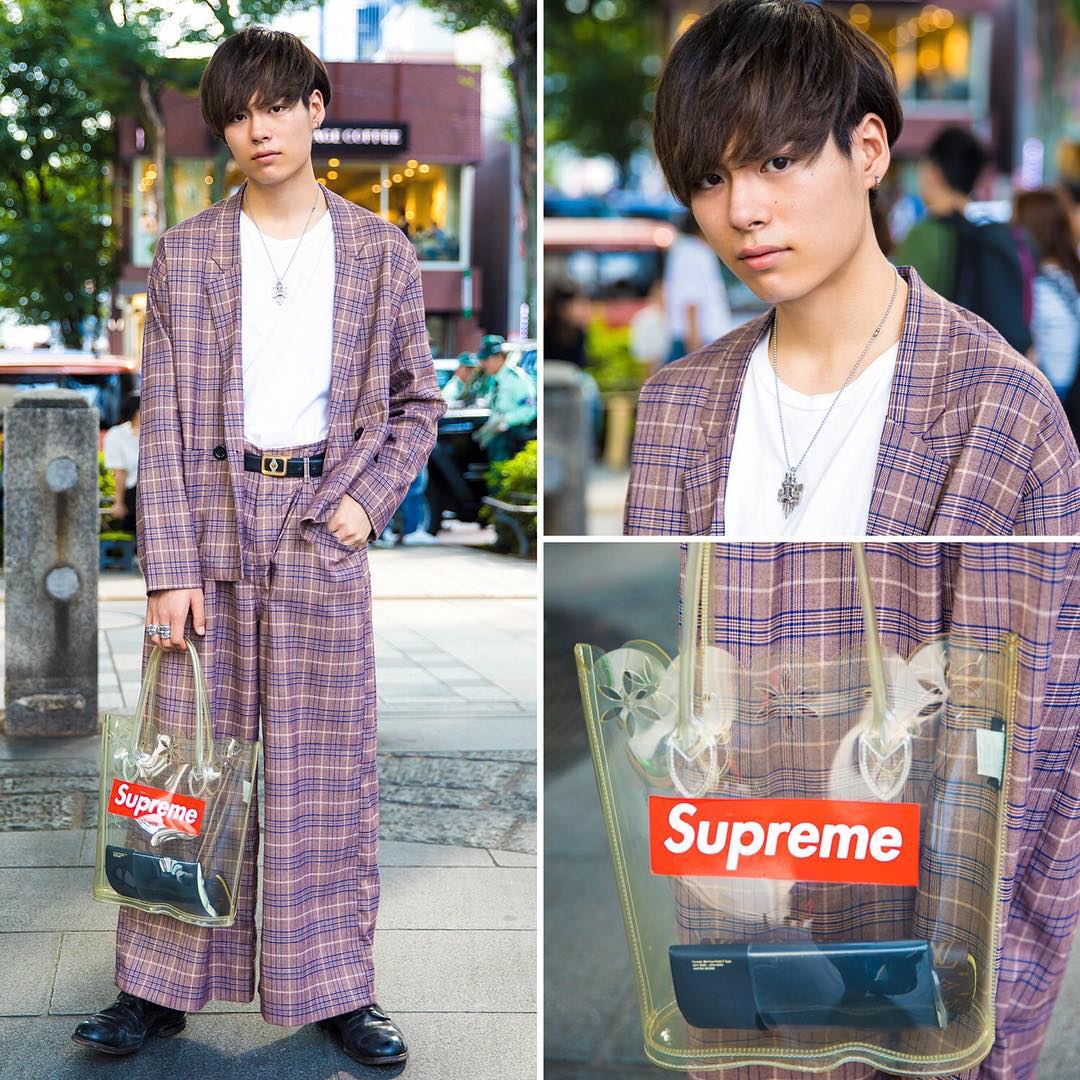 18-year-old Yuiga (@yamadayuiga) on the street in Harajuku wearing a vintage plaid suit with accessories from Comme Des Garcons, Issey Miyake, Supreme, and Chrome Hearts.