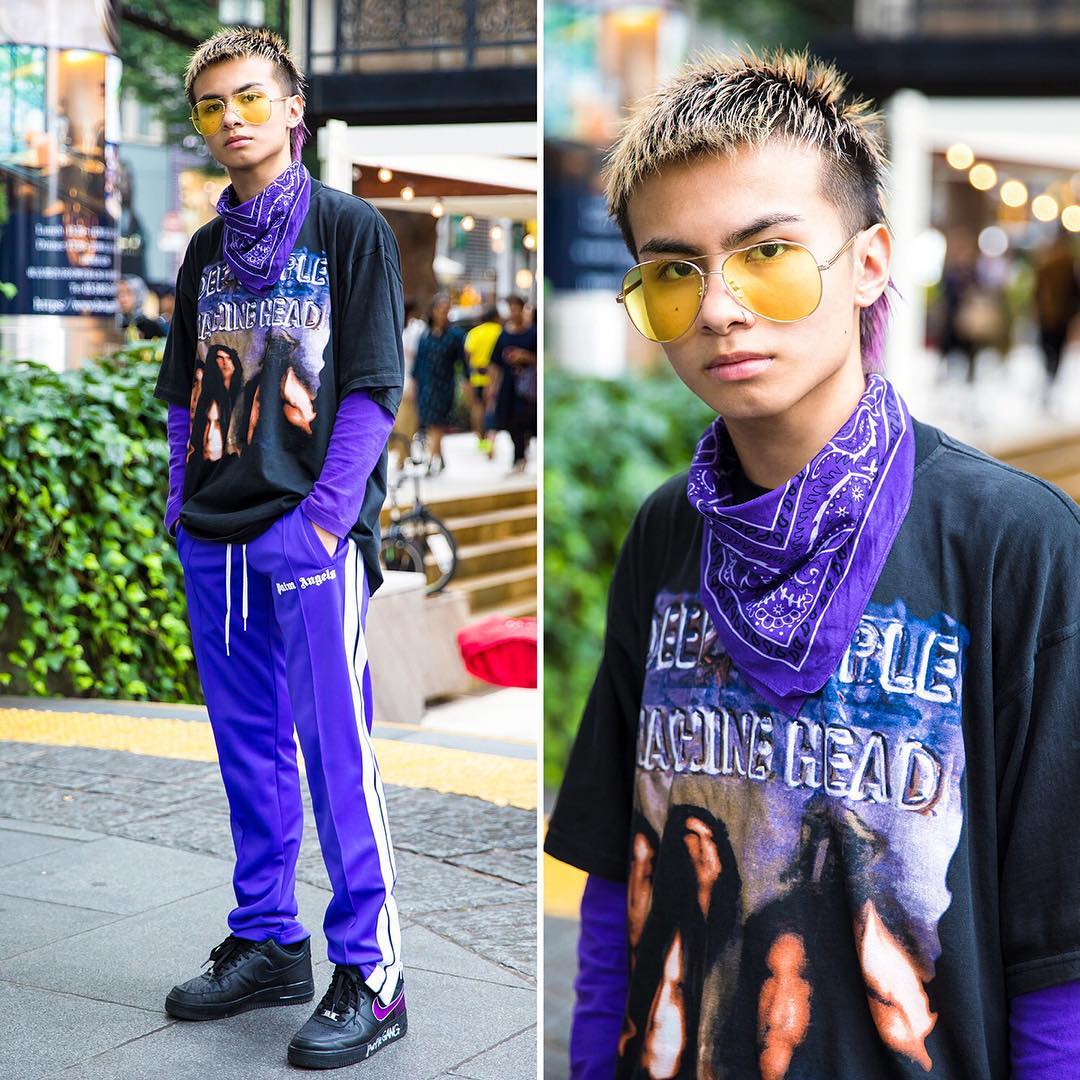 16-year-old Argene (@_argene_) on the street in Harajuku wearing a purple themed look with a band t-shirt over @PalmAngels sweatshirt, Palm Angels track pants, and Nike Air Force One sneakers.