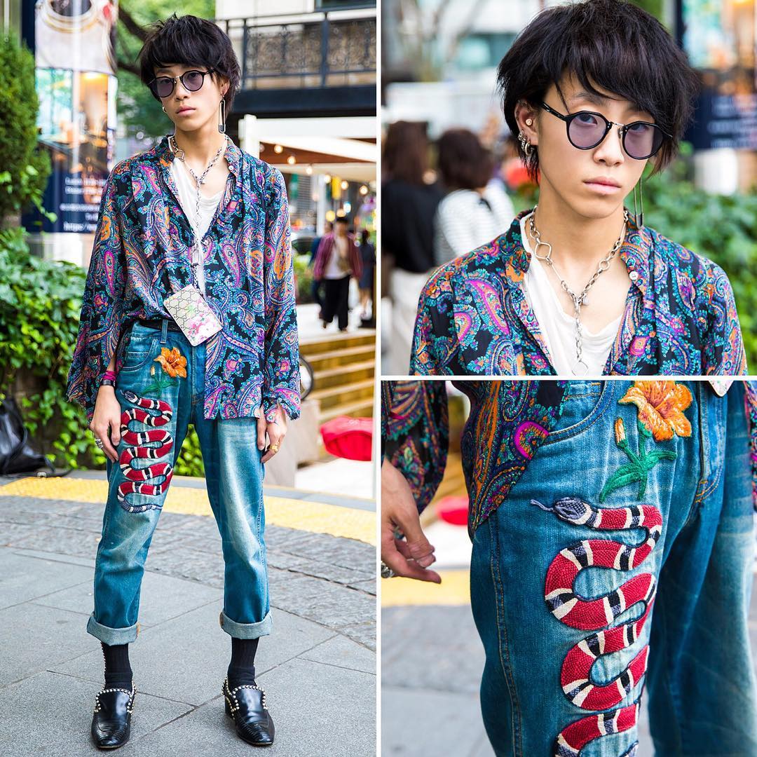 16-year-old Japanese high school student Yuu (@____momonai) on the street in Harajuku wearing a vintage paisley shirt with Gucci embroidered jeans, vintage studded shoes, and a Gucci neck wallet.