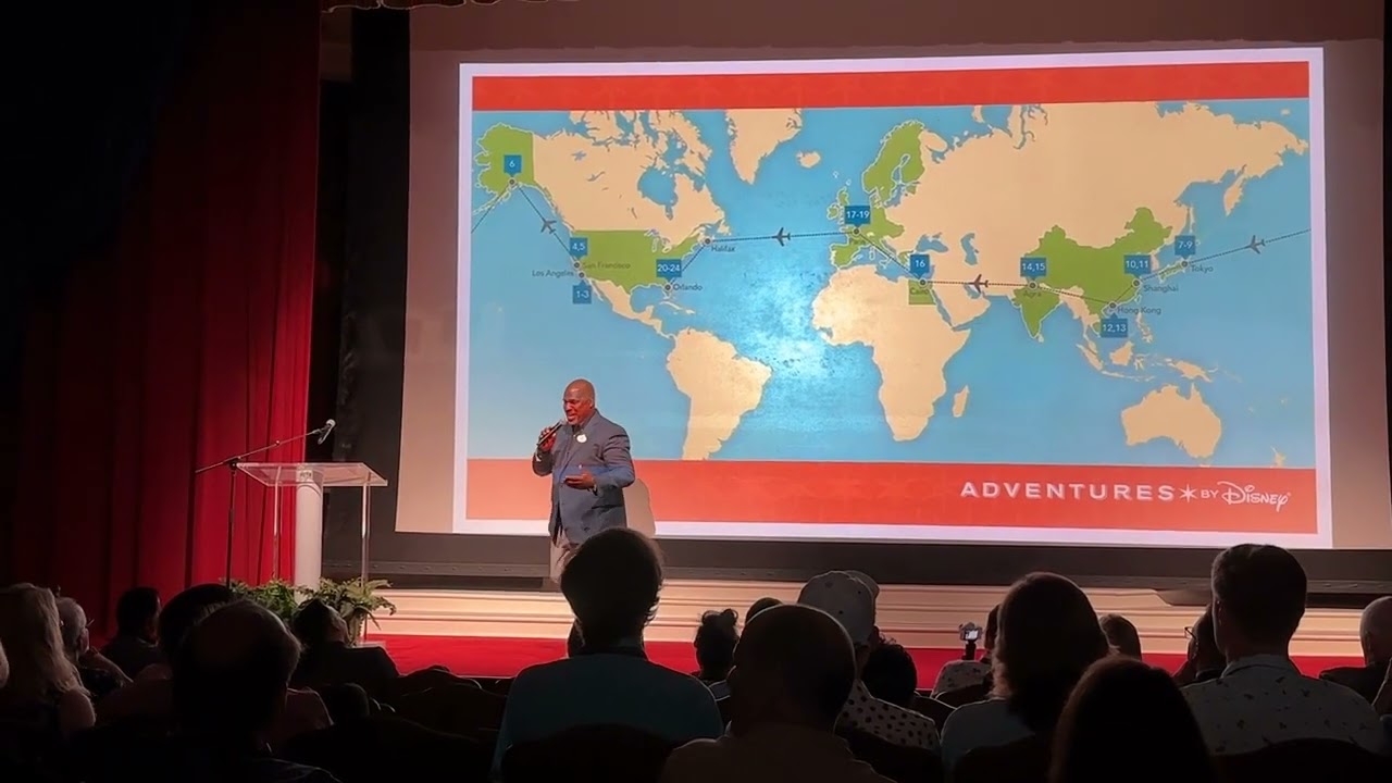 Adventure Leader Troy Johnson and Disney Archives Directory Becky Cline welcome guests embarking on an around the world Disney journey at the Opera House in Disneyland. This happened on Sunday, July 9 – Day One of the 24 day journey.