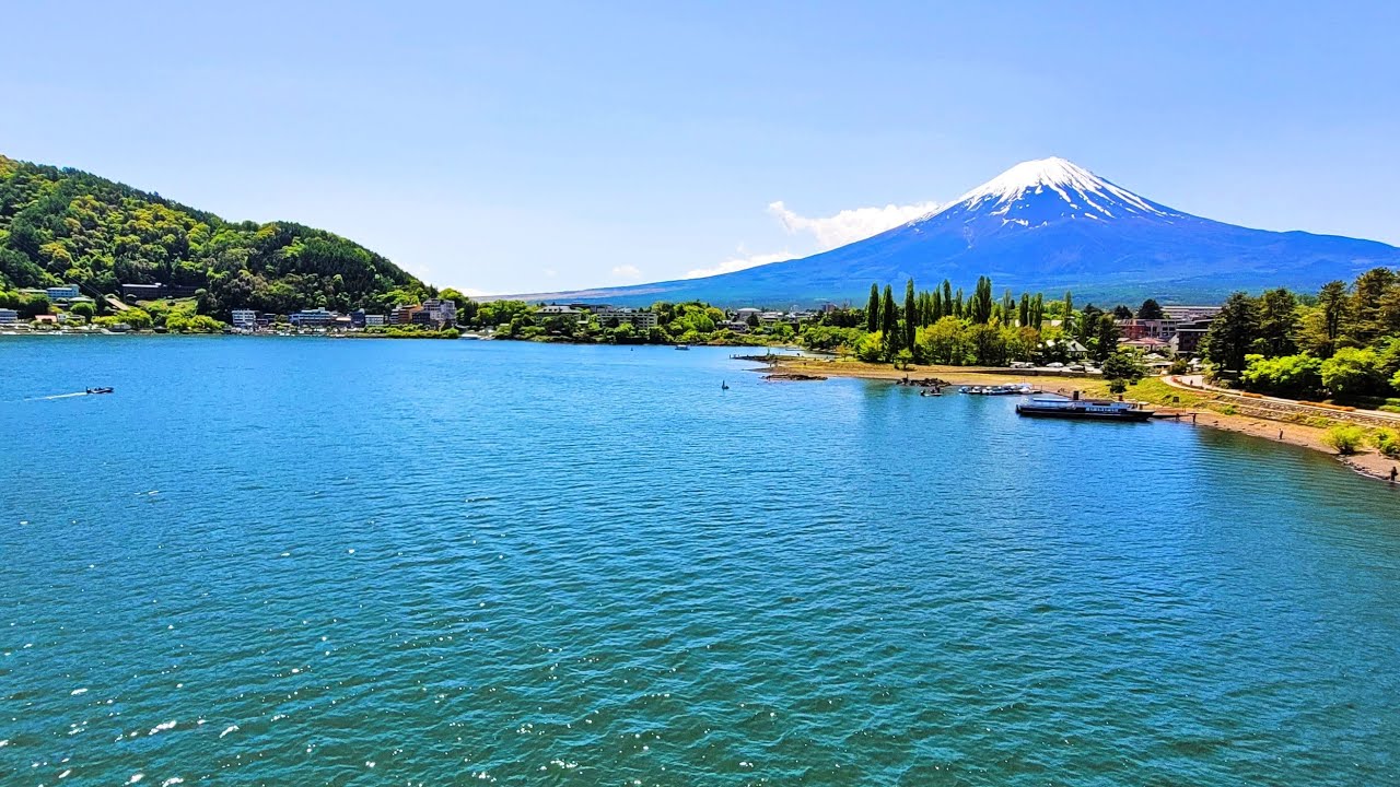 Japonia 2023. Orașul Fujikawaguchiko este cel mai bun loc pentru a filma Muntele Fuji. Am ajuns pe podul de pe lacul Kawaguchi, într-o zi excelentă, fără nori.
